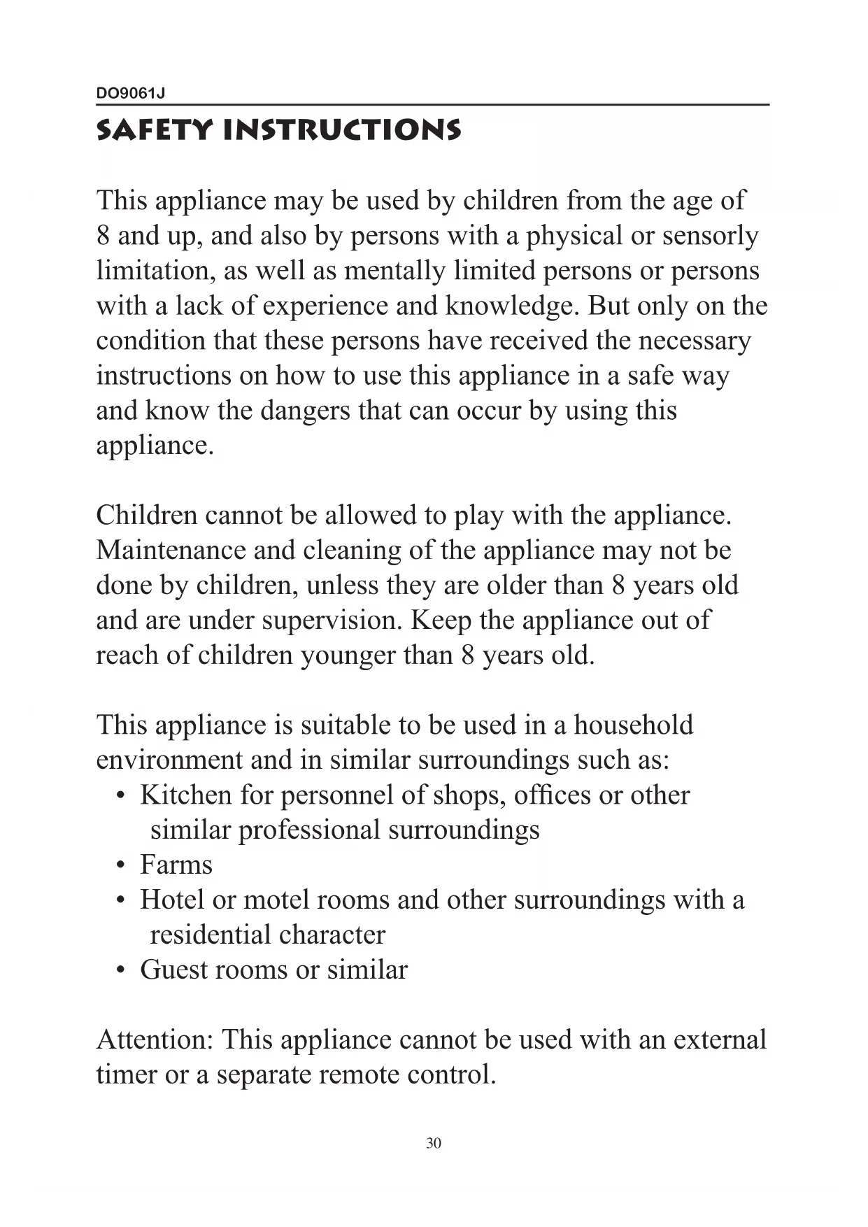 - Guest rooms or similar Attention: This appliance cannot be used with an external timer or a separate remote control.DO9061J