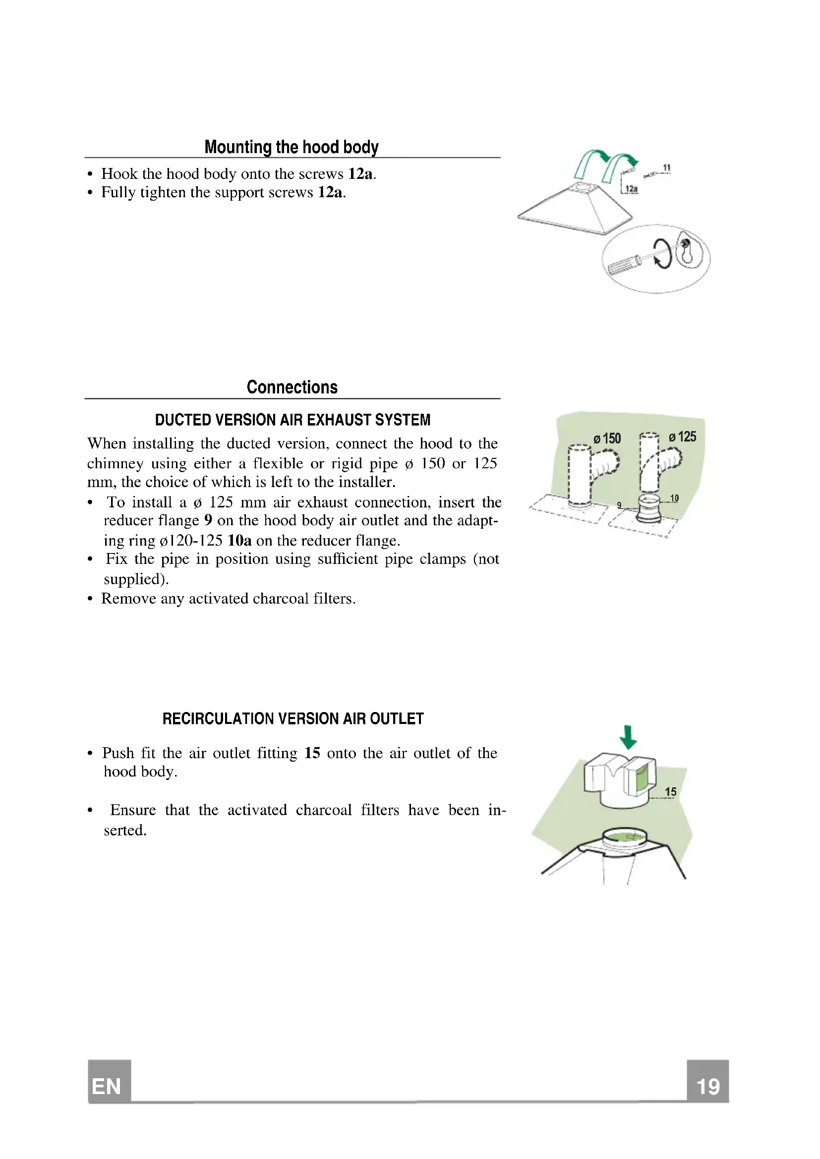 When installing the ducted version, connect the hood to the chimney using either a flexible or rigid pipe ø 150 or 125 mm, the choice of which is left to the installer.