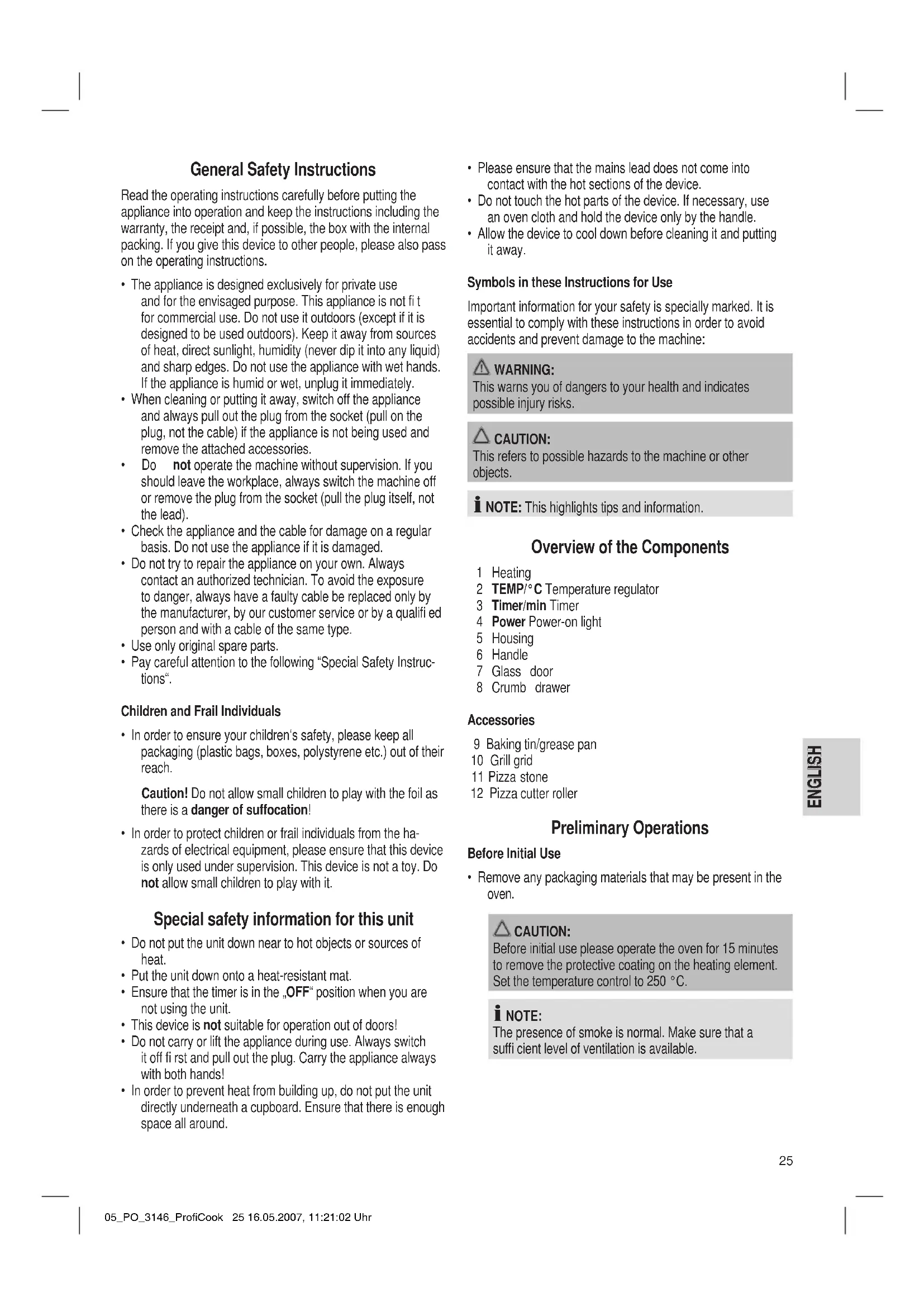- Remove any packaging materials that may be present in the oven. CAUTION: Before initial use please operate the oven for 15 minutes to remove the protective coating on the heating element. Set the temperature control to 250 °C. NOTE: The presence of smoke is normal. Make sure that a suffi cient level of ventilation is available. 05_PO_3146_ProfiCook 25 16.05.2007, 11:21:02 UhrENGLISH ENGLISH
