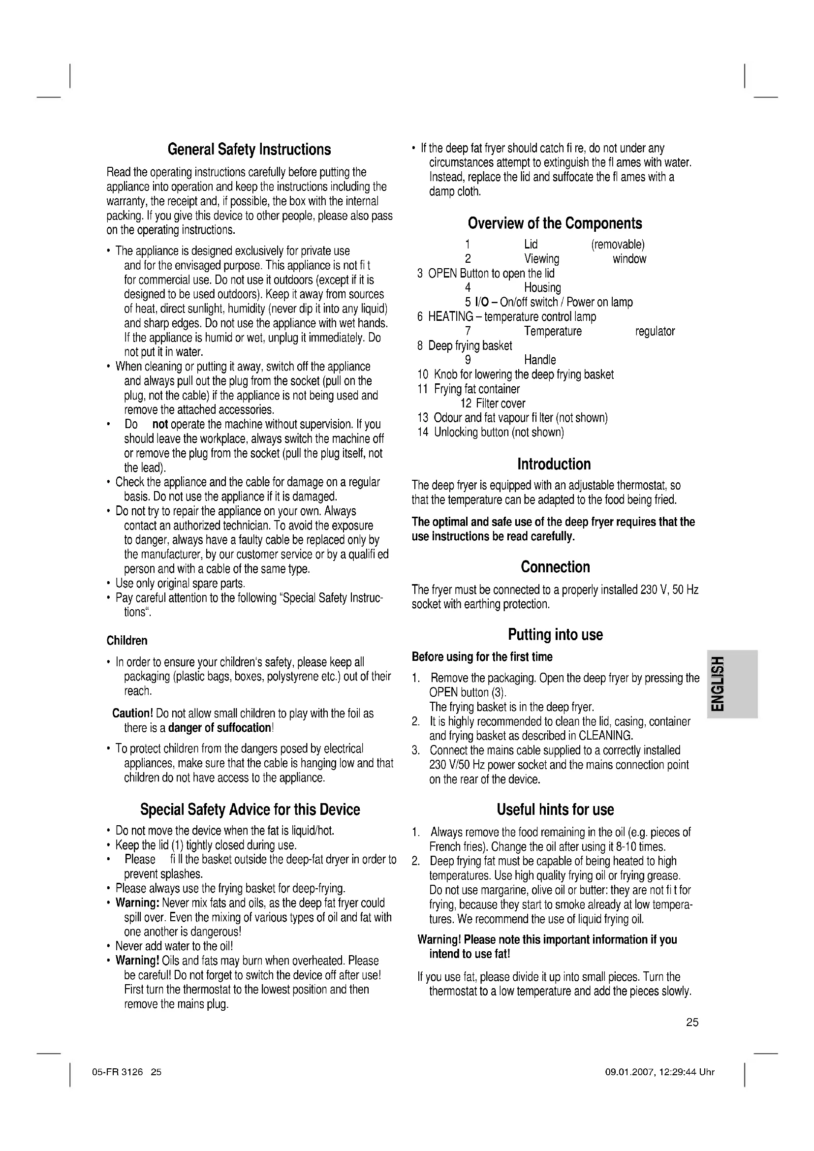 temperatures. Use high quality frying oil or frying grease. Do not use margarine, olive oil or butter: they are not fi t for frying, because they start to smoke already at low tempera- tures. We recommend the use of liquid frying oil. Warning! Please note this important information if you intend to use fat! If you use fat, please divide it up into small pieces. Turn the thermostat to a low temperature and add the pieces slowly. 05-FR 3126 25 09.01.2007, 12:29:44 UhrENGLISH ENGLISH