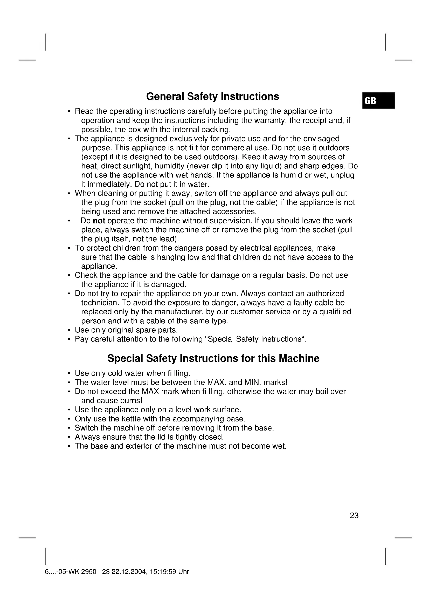 - The base and exterior of the machine must not become wet. 6....-05-WK 2950 23 22.12.2004, 15:19:59 UhrGB