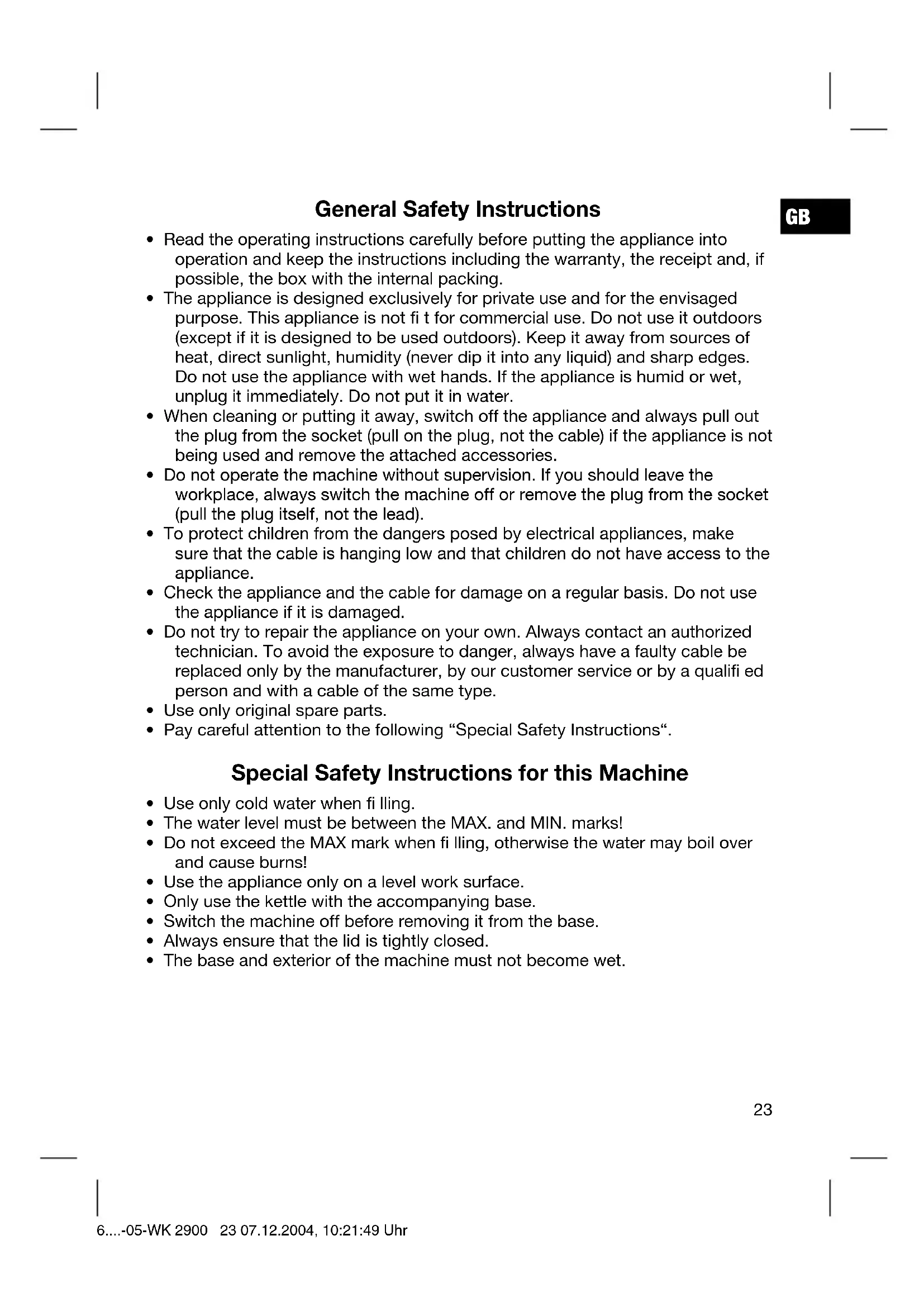 - The base and exterior of the machine must not become wet. 6....-05-WK 2900 23 07.12.2004, 10:21:49 UhrGB