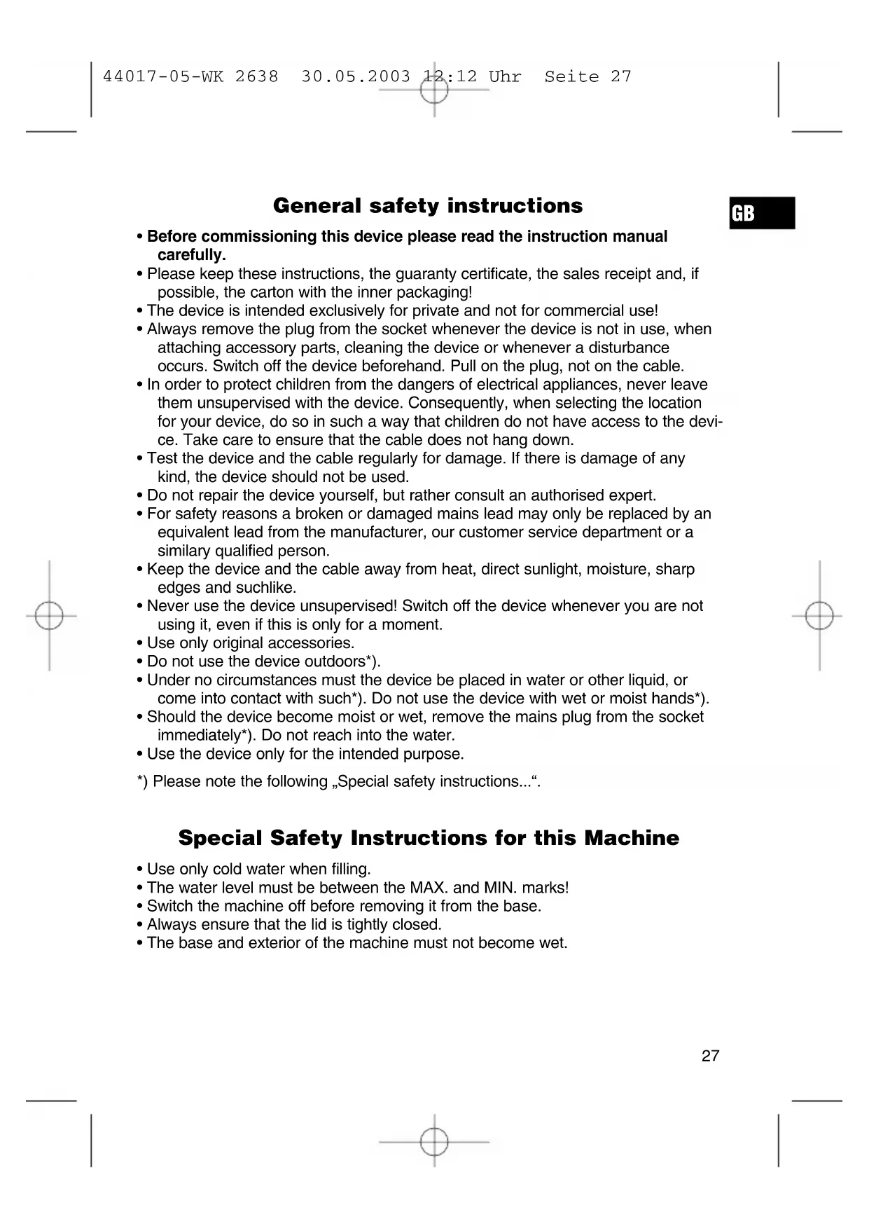 44017-05-WK 2638 30.05.2003 12:12 Uhr Seite 28Decalcification The decalcification intervals depend on the hardness of the water and the frequen- cy of use. Decalcification should be carried out every 3 to 4 months. If the machine switches off before the water boils, it probably needs to be decalci- fied. Please do not use vinegar but a commercially available decalcification agent on the basis of citric acid. Only use the quantities stated in the instructions. This appliance conforms with the CE directives for radio interference suppression and low-voltage safety and has been built to meet current safety requirements. Subject to technical changes without prior notice! Warranty We undertake to guarantee the appliance sold by our company for 24 months as of the date of purchase (cash receipt). Within the guarantee period we rectify faults to the machine free of charge which result from material or manufacturing faults, either by repairing the machine or, or our discretion, by replacement. Any such repair or replacement associated with the guarantee shall not cause the guarantee period to be extended, nor be deemed to be the start of a new guarantee period! Proof for the warranty is provided by the purchase document. The replacement and repair will not be performed free of charge without this proof of purchase. Should the warranty be valid, please consign the complete appliance in its original packing together with the cash receipt to your local dealer. Defects to the accessories do not entitle to the change of the appliance. These will be replaced free of charge. In this case do not send back the appliance. Just order the faulty accessory! Broken glass parts are replaced at the expense of the owner! Neither defects to consumables and wearing parts (e.g. motor pistons, kneading hooks, drive belts, spare remote controls, spare toothbrushes, saw blades, etc.) nor the cleaning, maintenance or change of wearing parts fall under this warranty and hence are subject to payment of costs! The warranty is terminated in case of handling on the part of Third parties. After the warranty Once the warranty has expired, repairs can be carried out by specialized technici- ans or repair services against the payment of the service.