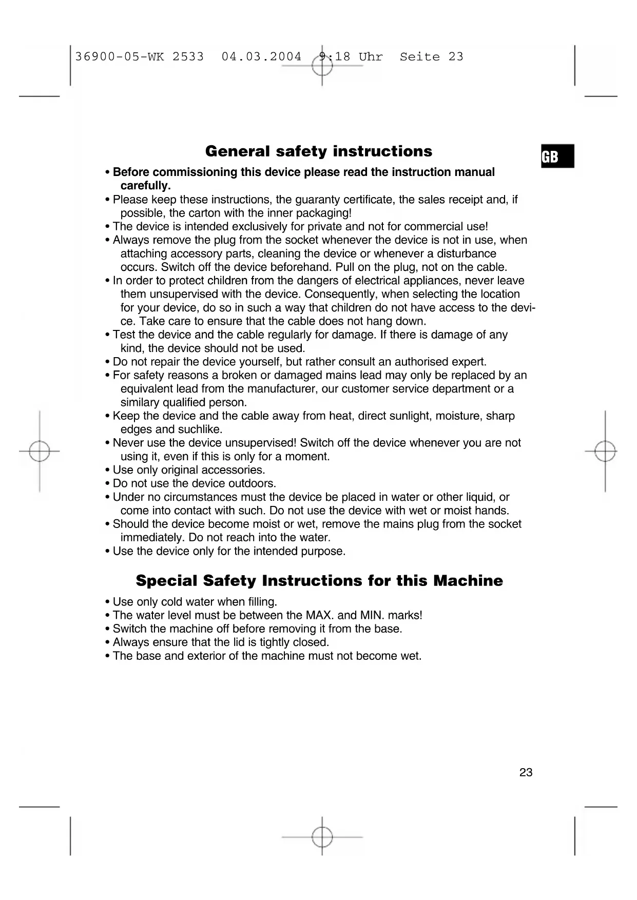 36900-05-WK 2533 04.03.2004 9:18 Uhr Seite 24Warranty We undertake to guarantee the appliance sold by our company for 24 months as of the date of purchase (cash receipt). During the life of the warranty we shall provide for the repair or replacement of the appliance owing to material or manufacturing defects absolutely free of charge. Proof for the warranty is provided by the purchase document. The replacement and repair will not be performed free of charge without this proof of purchase. Should the warranty be valid, please consign the complete appliance in its original packing together with the cash receipt to your local dealer. You are not entitled to the replacement of the appliance owing to broken glass parts and faulty accessories. However, said parts will be replaced free of charge. In this case only the faulty accessory needs to be ordered without sending back the whole appliance! The cleaning, servicing and replacement of wear parts are not covered by this war- ranty and hence are to be paid for. The warranty is terminated in case of handling on the part of Third parties. After the warranty Once the warranty has expired, repairs can be carried out by specialized technici- ans or repair services against the payment of the service.