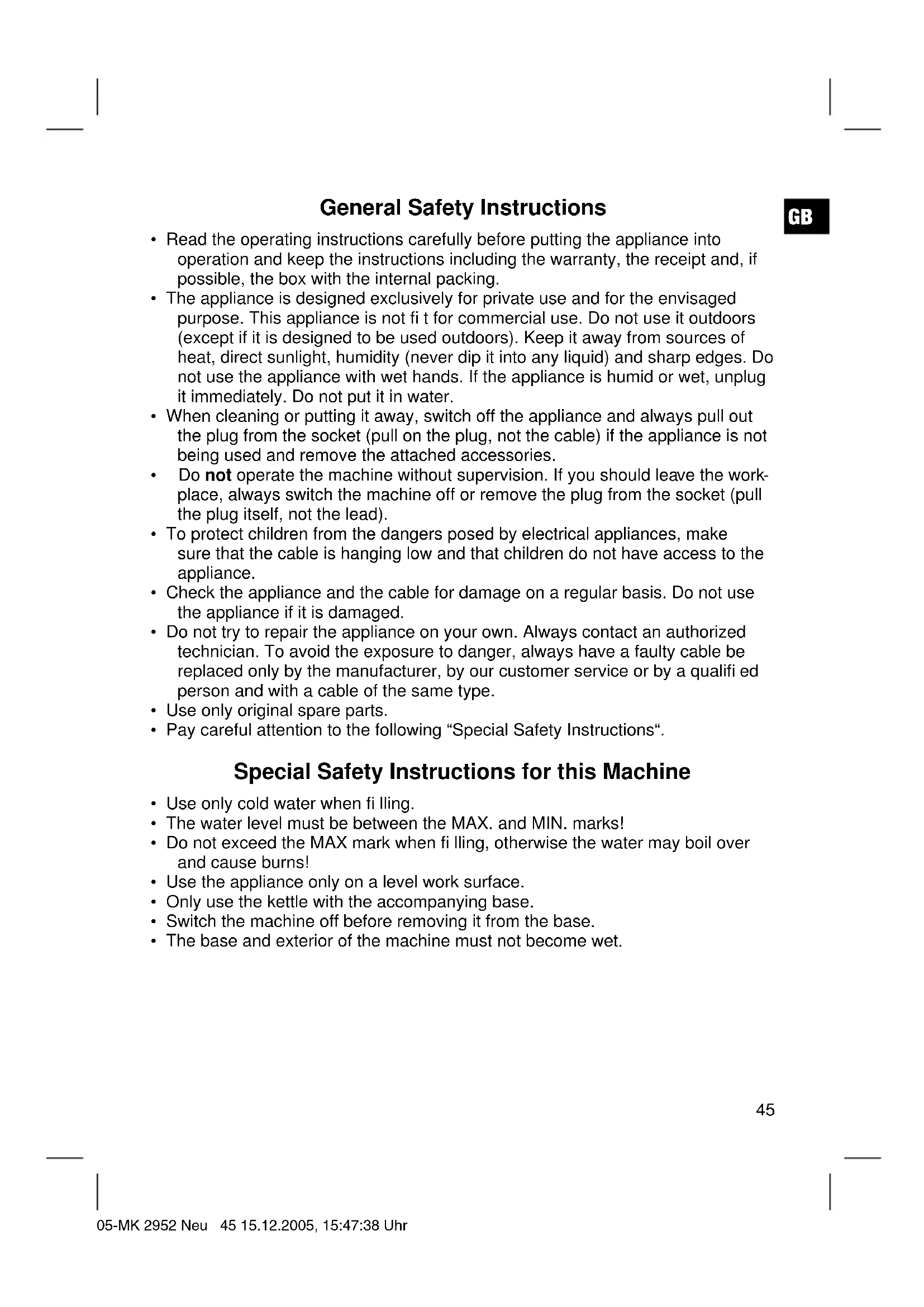 - The base and exterior of the machine must not become wet. 05-MK 2952 Neu 45 15.12.2005, 15:47:38 UhrGB