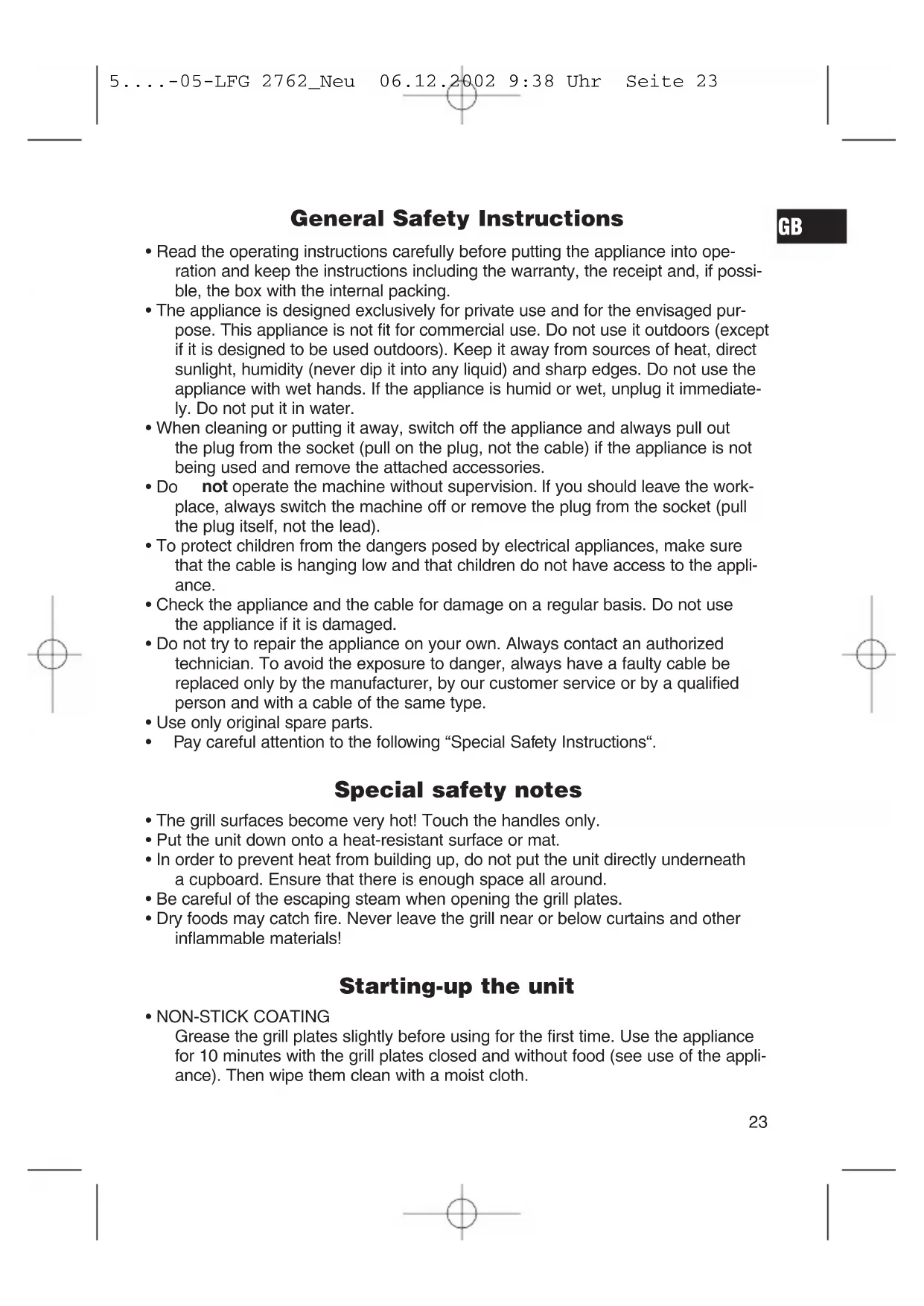 5....-05-LFG 2762_Neu 06.12.2002 9:38 Uhr Seite 24extension of the life of the guarantee nor do they give rise to any right to a new guarantee! Proof of the guarantee is provided by the proof of purchase. Without proof of purchase no free replacement or repair will be carried out. If you wish to make a claim under the guarantee please return the entire machine in the original packaging to your dealer together with the receipt. *) Damage to accessories does not mean automatic free replacement of the whole machine. In such cases please contact our hotline. Broken glass or breakage of plastic parts are always subject to a charge. Defects to consumables or parts subject to wearing (e.g. motor pistons, kneading blades, drive shafts, spare remote control, spare toothbrushes, saw blades, etc.) as well as cleaning, maintenance or the replacement of said parts are not covered by the guarantee and hence are to be paid! The guarantee lapses in case of unauthorized tampering. After the expiry of the guarantee After the expiry of the guarantee repairs can be carried by the competent dealer or repair service against the payment of the ensuing costs.
