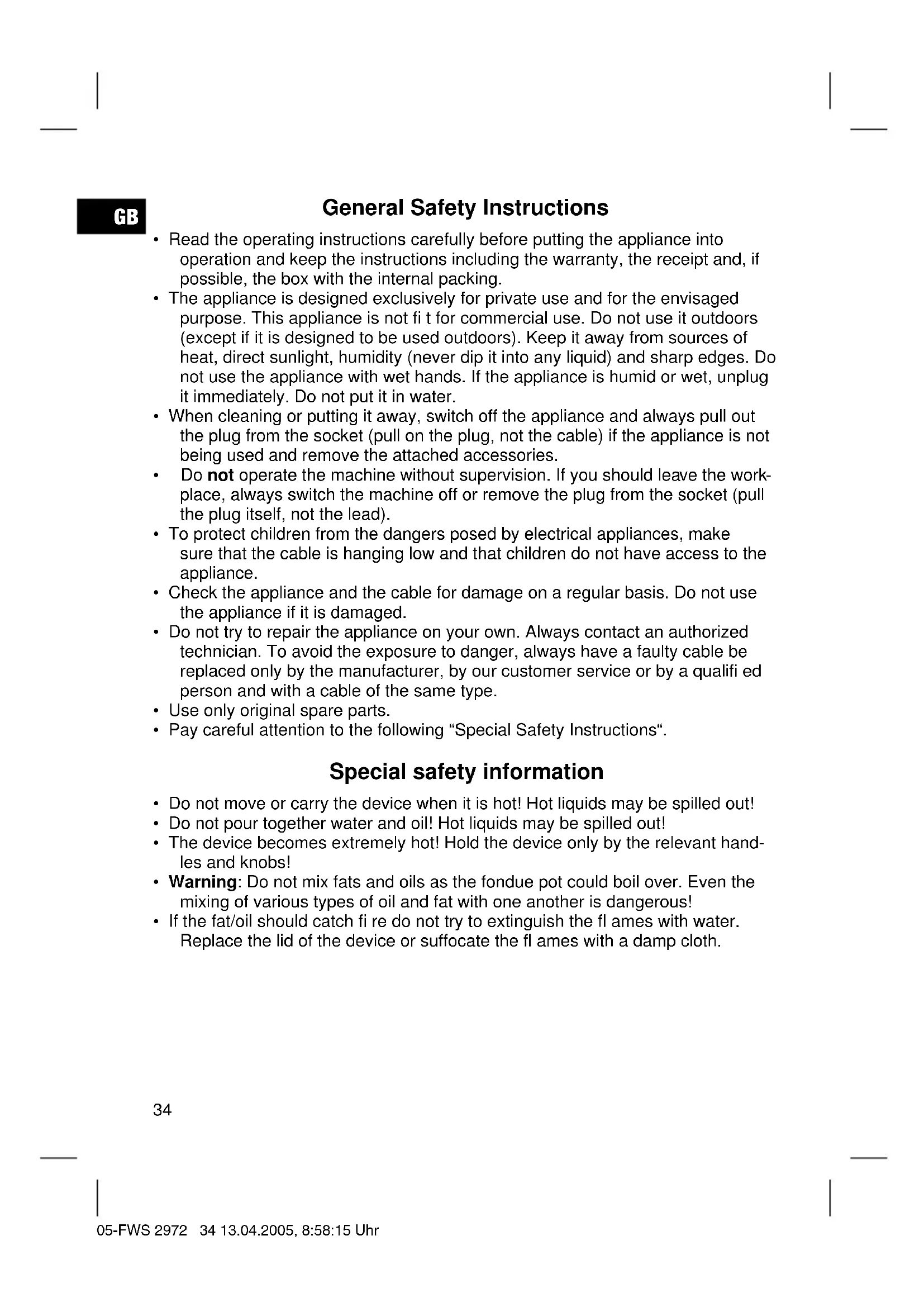 - If the fat/oil should catch fi re do not try to extinguish the fl ames with water. Replace the lid of the device or suffocate the fl ames with a damp cloth. 05-FWS 2972 34 13.04.2005, 8:58:15 UhrGB