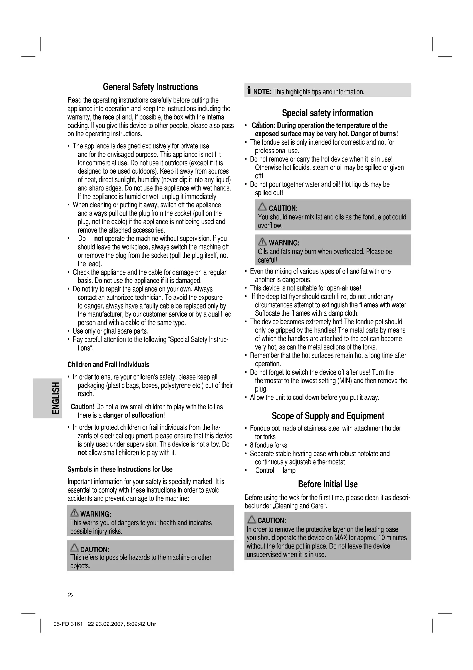 - Control lamp Before Initial Use Before using the wok for the fi rst time, please clean it as descri- bed under „Cleaning and Care“. CAUTION: In order to remove the protective layer on the heating base you should operate the device on MAX for approx. 10 minutes without the fondue pot in place. Do not leave the device unsupervised when it is in use. 05-FD 3161 22 23.02.2007, 8:09:42 UhrENGLISH ENGLISH