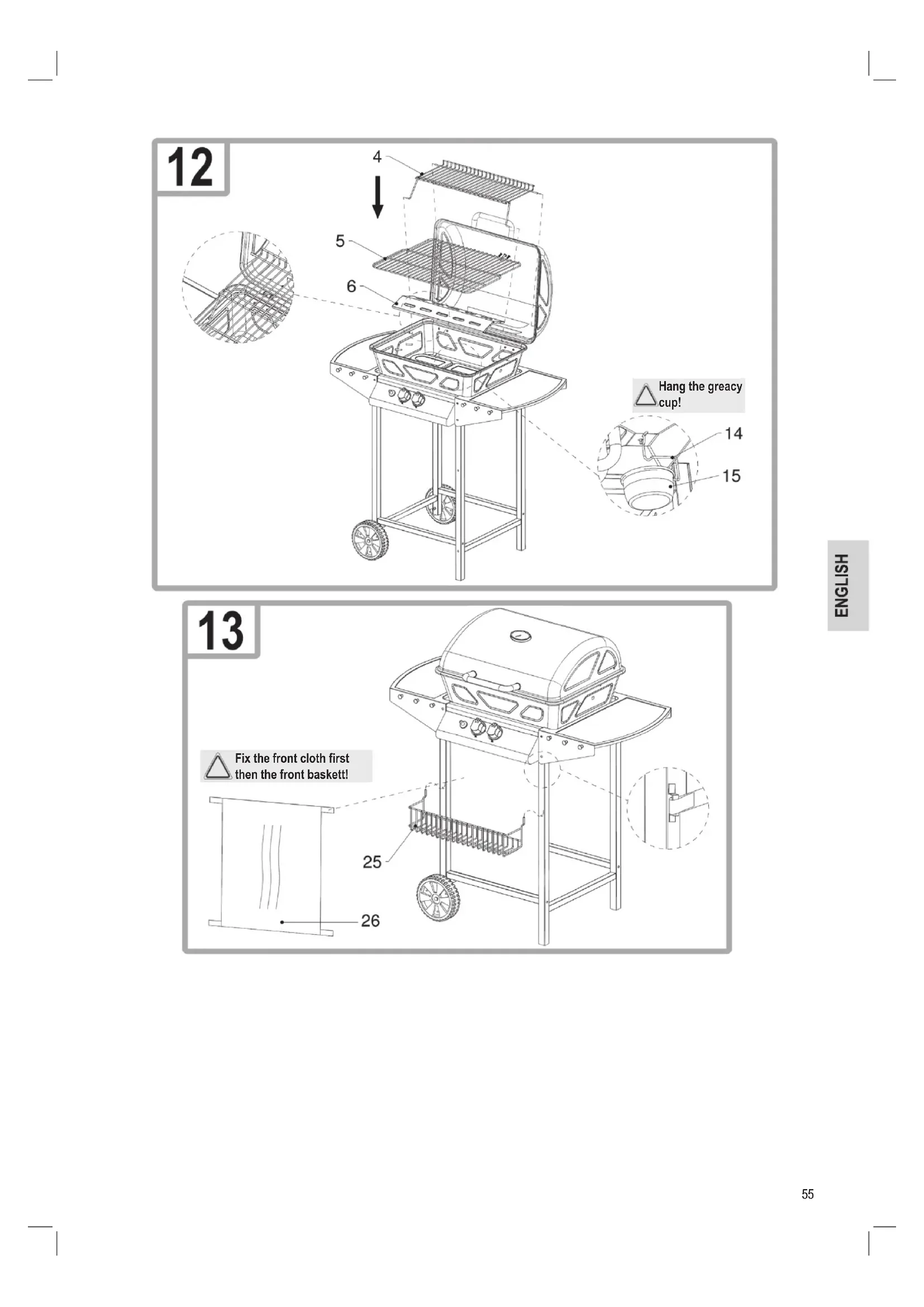 Pcs E M5 Nut 4Pcs Clip 2PCS Hinge Axle 2PCS Connect the hinge arms with a hinge hook. (9). Fix the lid with “Hinge Axle and Clip”.55 Fix the front cloth first then the front baskett! Hang the greacy cup!56 Gas Connection General information The barbecue can be operated with gas cylinders weighing between 5 kg and 11 kg. Low pressure butane, propane and LPG gas mixtures are approved. Your barbecue works best with propane gas and LPG mixtures. Butane can be used, on account of the power rating of the appliance, the gas cylinder may however freeze. As a result of this, the gas pressure drops and your barbecue does not provide full power. Use a regulator which is certied in accordance with DIN EN 12864:2001. NOTE: For information concerning the correct regulator for gas cylinders, please consult your LPG dealer. Regulator and hose These parts are supplied with the barbecue. You can obtain spare parts from your dealer or an approved LPG supplier. Only use hoses and regulators at the pressure stated above which are approved for LPG. Normally, the service life of a regulator is 2 years. It is recommended that the regulator is replaced within 2 years of the production date.