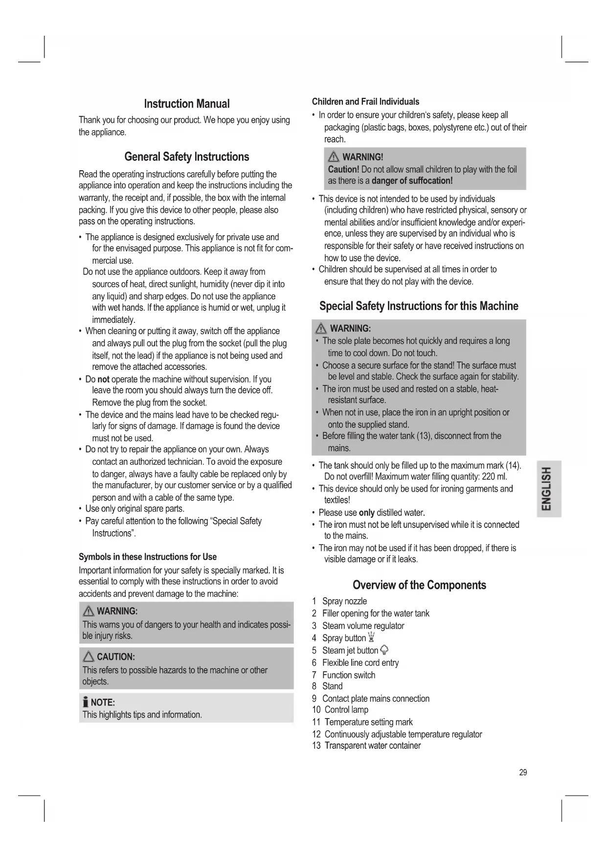 - The iron may not be used if it has been dropped, if there is visible damage or if it leaks. Overview of the Components 1 Spray nozzle 2 Filler opening for the water tank 3 Steam volume regulator 4 Spray button 5 Steam jet button 6 Flexible line cord entry 7 Function switch 8 Stand 9 Contact plate mains connection 10 Control lamp 11 Temperature setting mark 12 Continuously adjustable temperature regulator 13 Transparent water container30 14 MAX mark for water level 15 Ceramic sole plate Instructions Unpacking