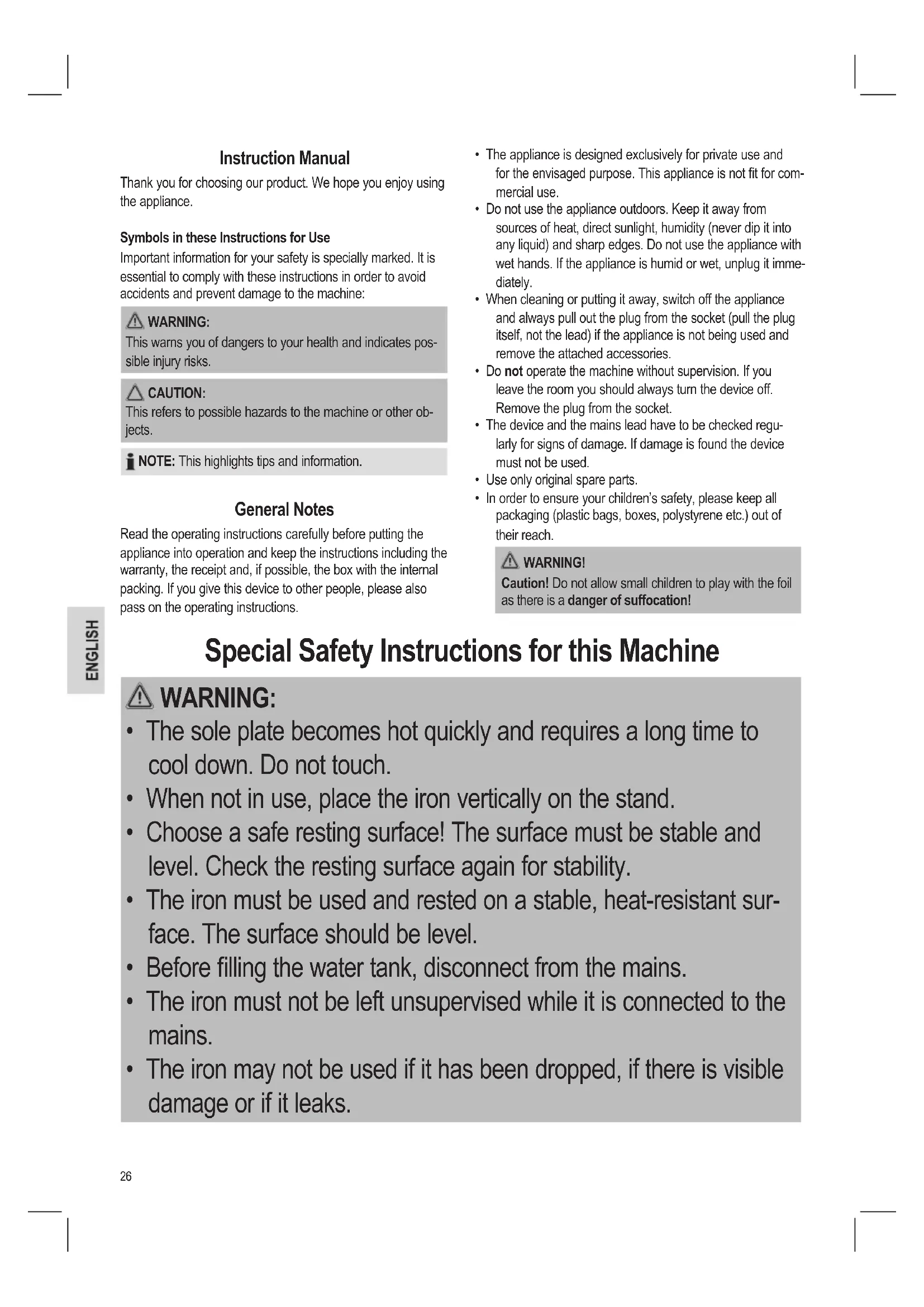- In order to ensure your children’s safety, please keep all packaging (plastic bags, boxes, polystyrene etc.) out of their reach. WARNING! Caution! Do not allow small children to play with the foil as there is a danger of suffocation! Instruction Manual Thank you for choosing our product. We hope you enjoy using the appliance. Symbols in these Instructions for Use Important information for your safety is specially marked. It is essential to comply with these instructions in order to avoid accidents and prevent damage to the machine: