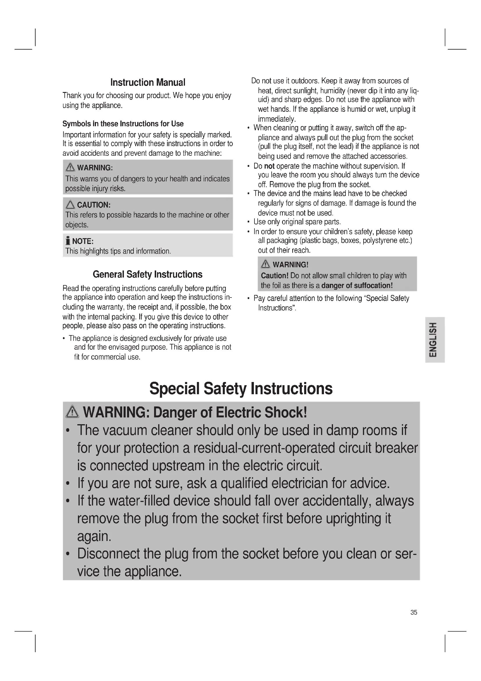 - The vacuum cleaner should only be used in damp rooms if for your protection a residual-current-operated circuit breaker is connected upstream in the electric circuit.