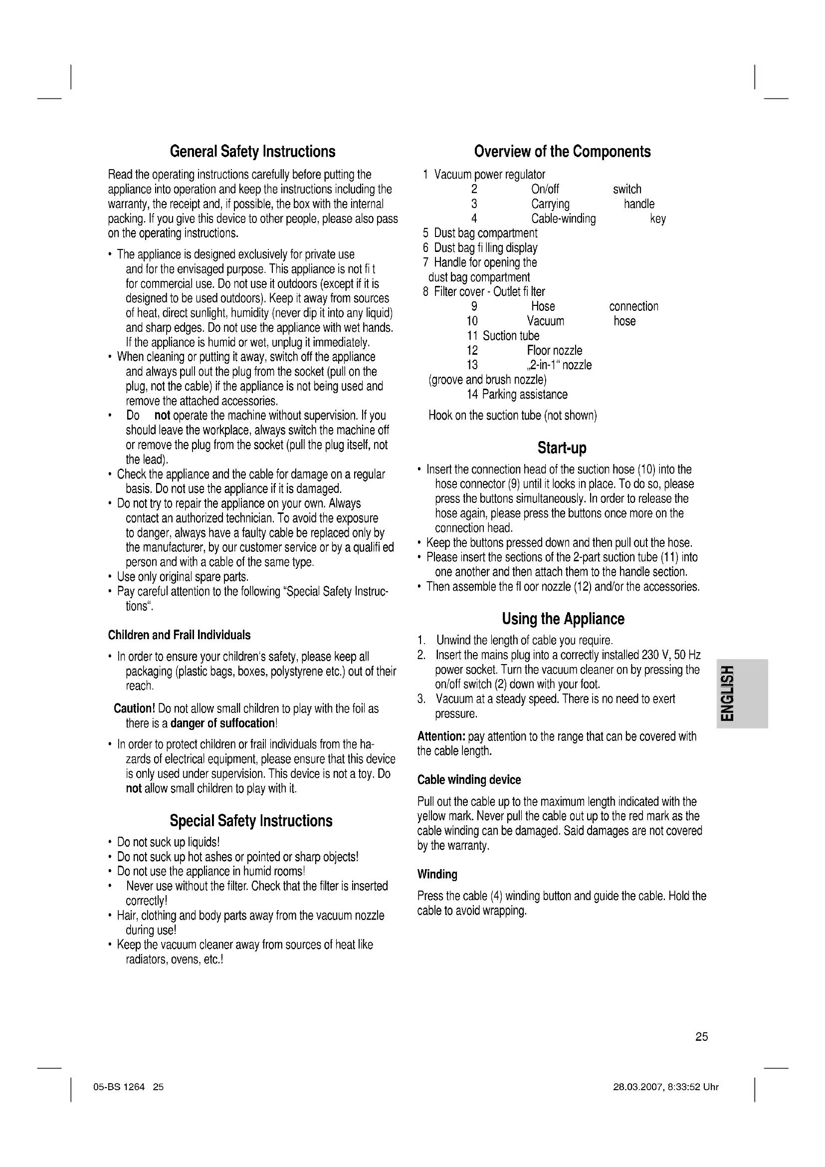- Keep the vacuum cleaner away from sources of heat like radiators, ovens, etc.! Overview of the Components 1 Vacuum power regulator 2 On/off switch 3 Carrying handle 4 Cable-winding key 5 Dust bag compartment 6 Dust bag fi lling display 7 Handle for opening the dust bag compartment 8 Filter cover - Outlet fi lter 9 Hose connection 10 Vacuum hose 11 Suction tube 12 Floor nozzle 13 „2-in-1“ nozzle (groove and brush nozzle) 14 Parking assistance Hook on the suction tube (not shown) Start-up