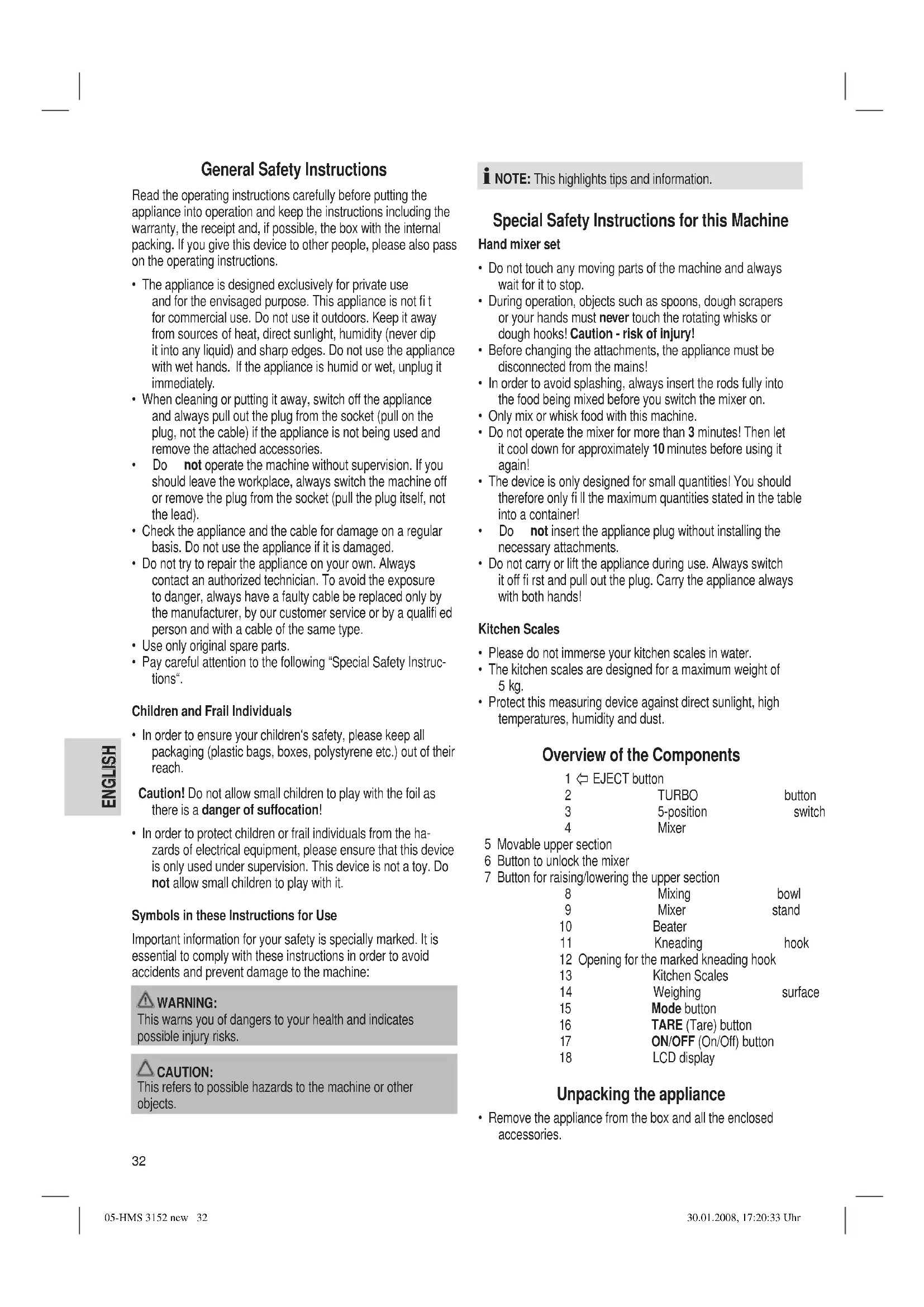 - Remove the appliance from the box and all the enclosed accessories. 05-HMS 3152 new 32 30.01.2008, 17:20:33 UhrENGLISH ENGLISH
