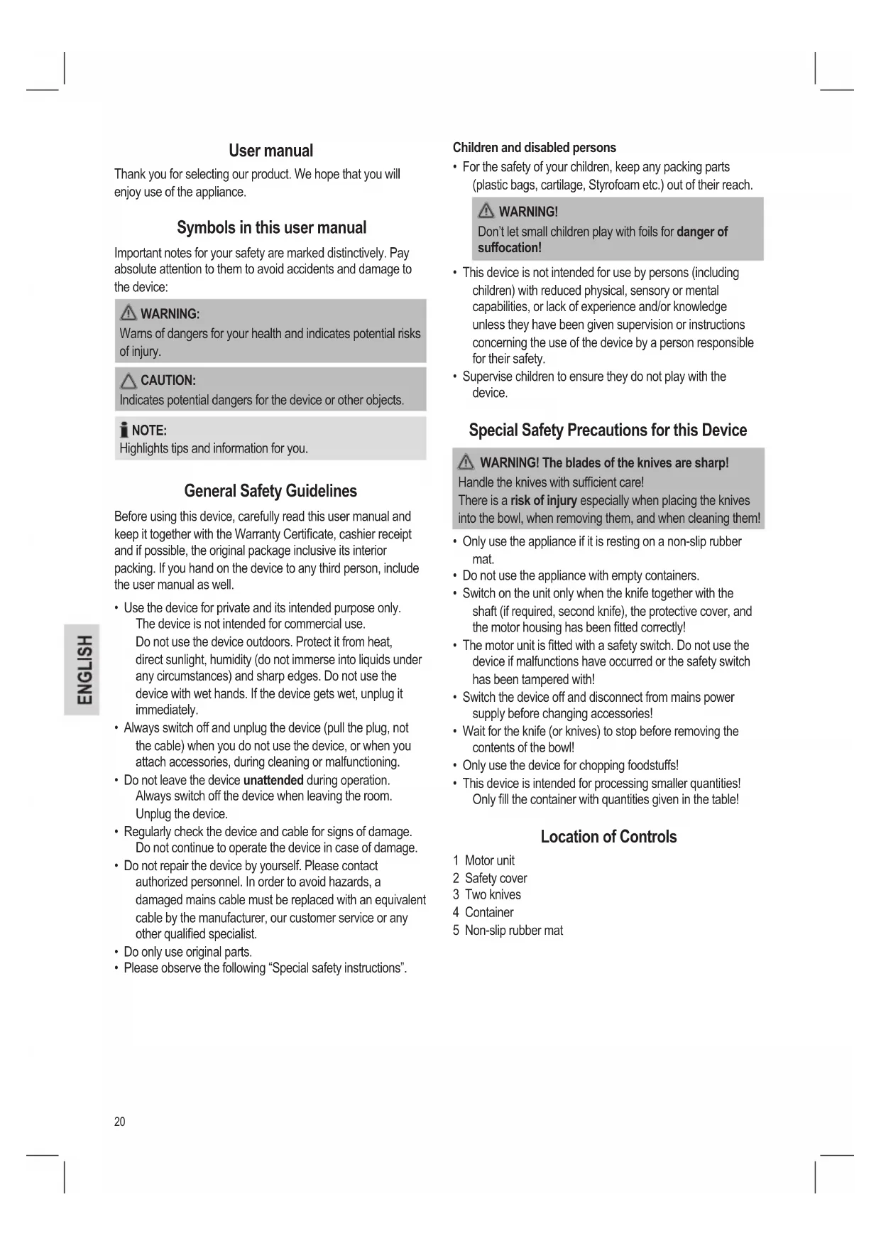 - This device is intended for processing smaller quantities! Only ll the container with quantities given in the table! Location of Controls 1 Motor unit 2 Safety cover 3 Two knives 4 Container 5 Non-slip rubber mat User manual Thank you for selecting our product. We hope that you will enjoy use of the appliance. Symbols in this user manual Important notes for your safety are marked distinctively. Pay absolute attention to them to avoid accidents and damage to the device: