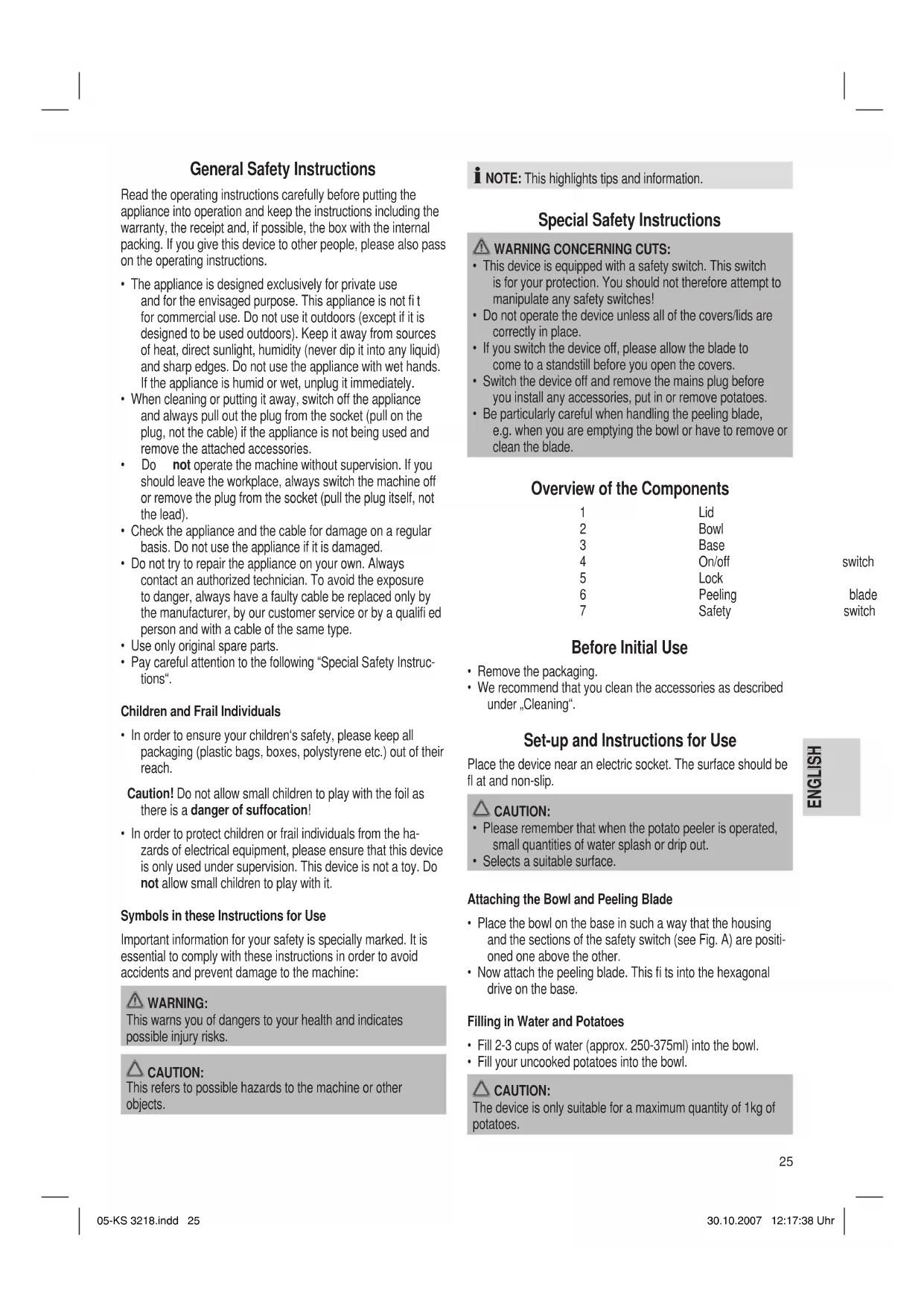 - Please be particularly careful when handling the peeling blade! Troubleshooting Fault Possible Cause Remedy The device does not work Is the device switched on? Check the position of the on/off switch Is the electric socket broken? Try a different socket The safety switch is not being pressed Check whether the bowl and the lid are correctly positioned The device is noisy during operation The device is un- balanced because you are using potatoes of different sizes Sort the potatoes into different size categories or support the device with your hand Noise development The sound pressure level in the ear of an operator (LpA) was measured according to DIN EN ISO 3744. Sound pressure level detected: 82,0 dB(A) (no limit) Technical Data Model: ...............................................................................KS 3218 Power supply: ............................................................230 V, 50 Hz Power consumption: ..............................................................70 W Protection class: ........................................................................... Ι Net weight: .........................................................................1,62 kg This device has been tested according to all relevant current CE guidelines, such as electromagnetic compatibility and low voltage directives, and has been constructed in accordance with the latest safety regulations. Subject to technical changes without prior notice! 05-KS 3218.indd 2605-KS 3218.indd 26 30.10.2007 12:17:38 Uhr30.10.2007 12:17:38 UhrENGLISH ENGLISH