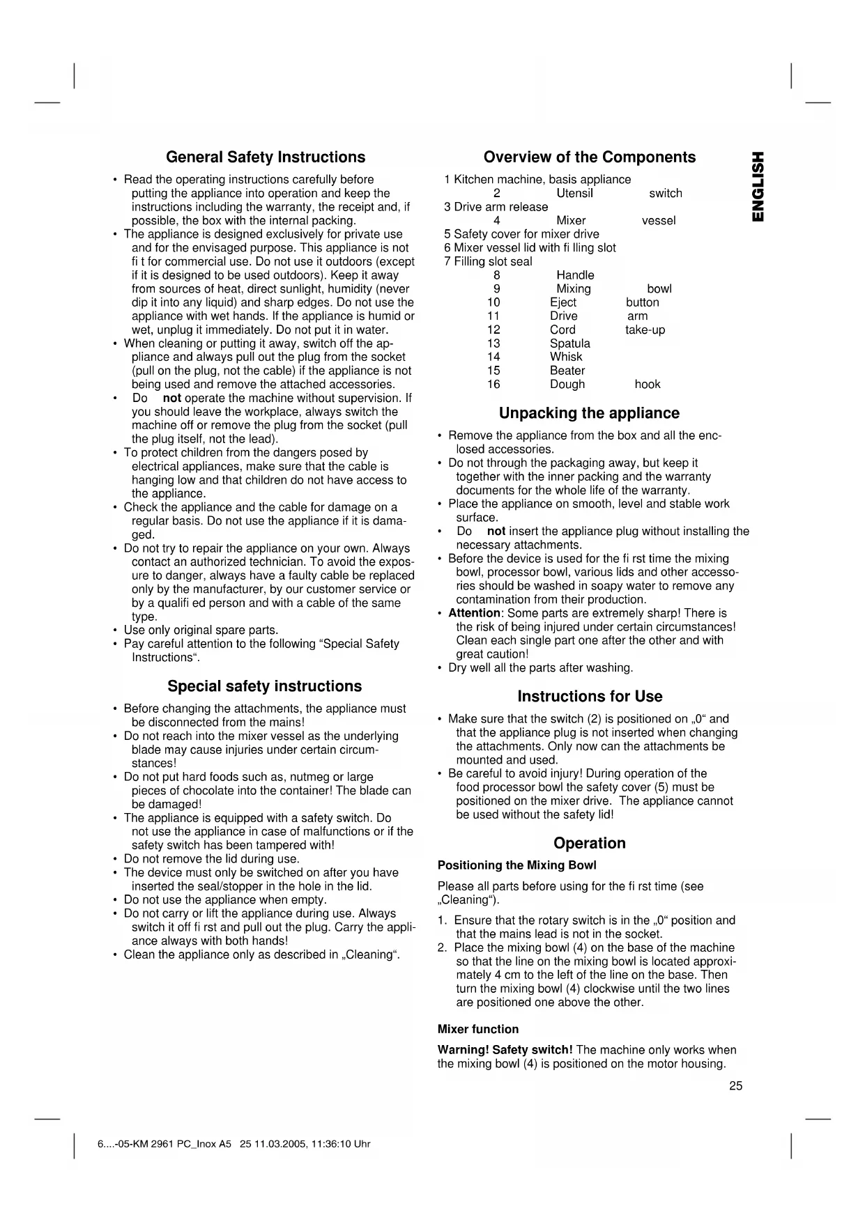 so that the line on the mixing bowl is located approxi- mately 4 cm to the left of the line on the base. Then turn the mixing bowl (4) clockwise until the two lines are positioned one above the other. Mixer function Warning! Safety switch! The machine only works when the mixing bowl (4) is positioned on the motor housing. 6....-05-KM 2961 PC_Inox A5 25 11.03.2005, 11:36:10 UhrENGLISH