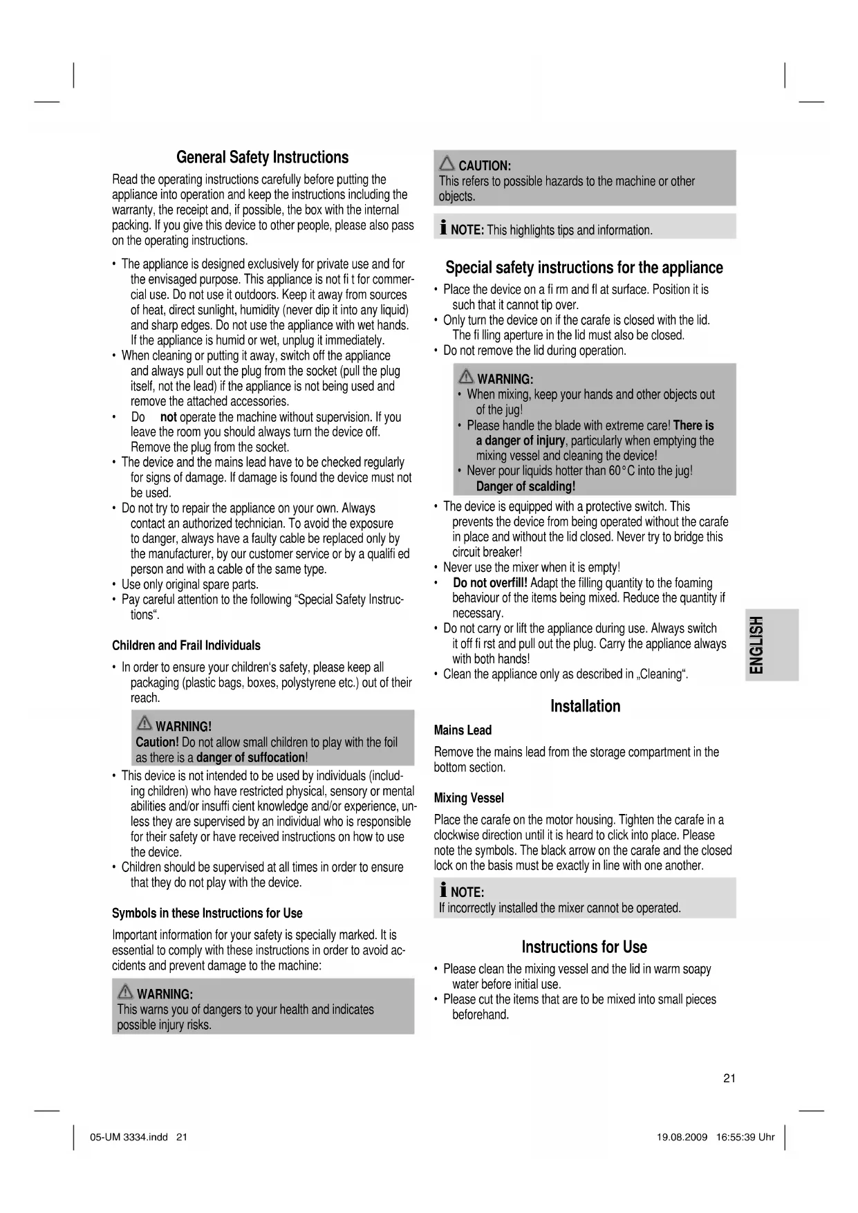 Remedy: Check that the mixing vessel and the lid are fi rmly in place. Noise development The sound pressure level in the ear of an operator (LpA) was measured according to DIN EN ISO 3744. Sound pressure level detected: 85 dB(A) (no limit) Technical Data Model: ..............................................................................UM 3334 Power supply: ..............................................220-240 V~ 50/60 Hz Power consumption: ............................................................500 W Protection class: ...........................................................................II Short-term operation: ...........................................................3 Min. Net weight: .........................................................................1.93 kg This device has been tested according to all relevant current CE guidelines, such as electromagnetic compatibility and low voltage directives, and has been constructed in accordance with the latest safety regulations. Subject to technical changes without prior notice! Meaning of the “Dustbin” Symbol Protect our environment: do not dispose of electrical equipment in the domestic waste. Please return any electrical equipment that you will no longer use to the collection points provided for their disposal. This helps avoid the potential effects of incorrect disposal on the environment and human health. This will contribute to the recycling and other forms of reutilisa- tion of electrical and electronic equipment. Information concerning where the equipment can be disposed of can be obtained from your local authority. 05-UM 3334.indd 2305-UM 3334.indd 23 19.08.2009 16:55:39 Uhr19.08.2009 16:55:39 Uhr24
