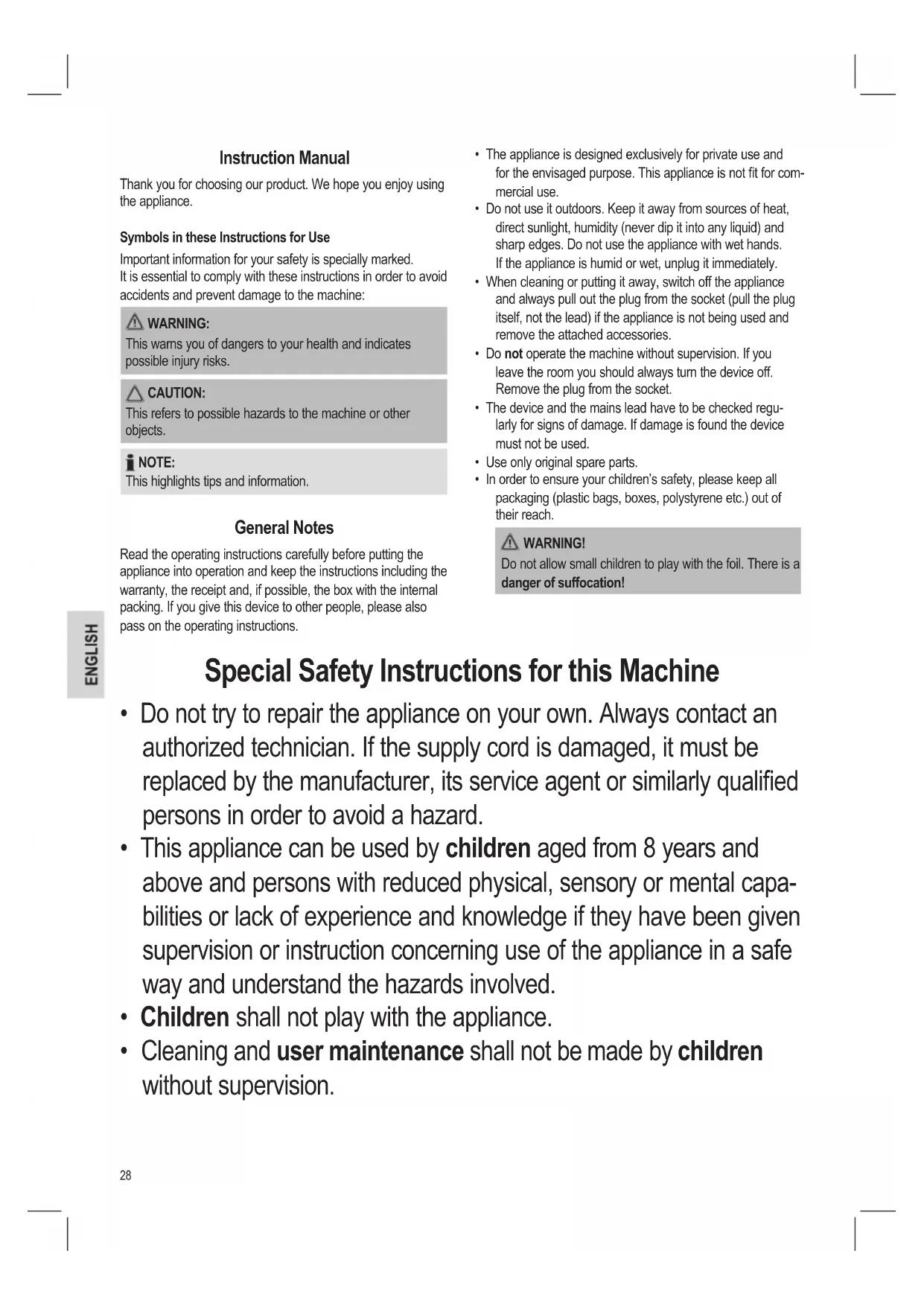 - In order to ensure your children’s safety, please keep all packaging (plastic bags, boxes, polystyrene etc.) out of their reach. WARNING! Do not allow small children to play with the foil. There is a danger of suffocation! Special Safety Instructions for this Machine