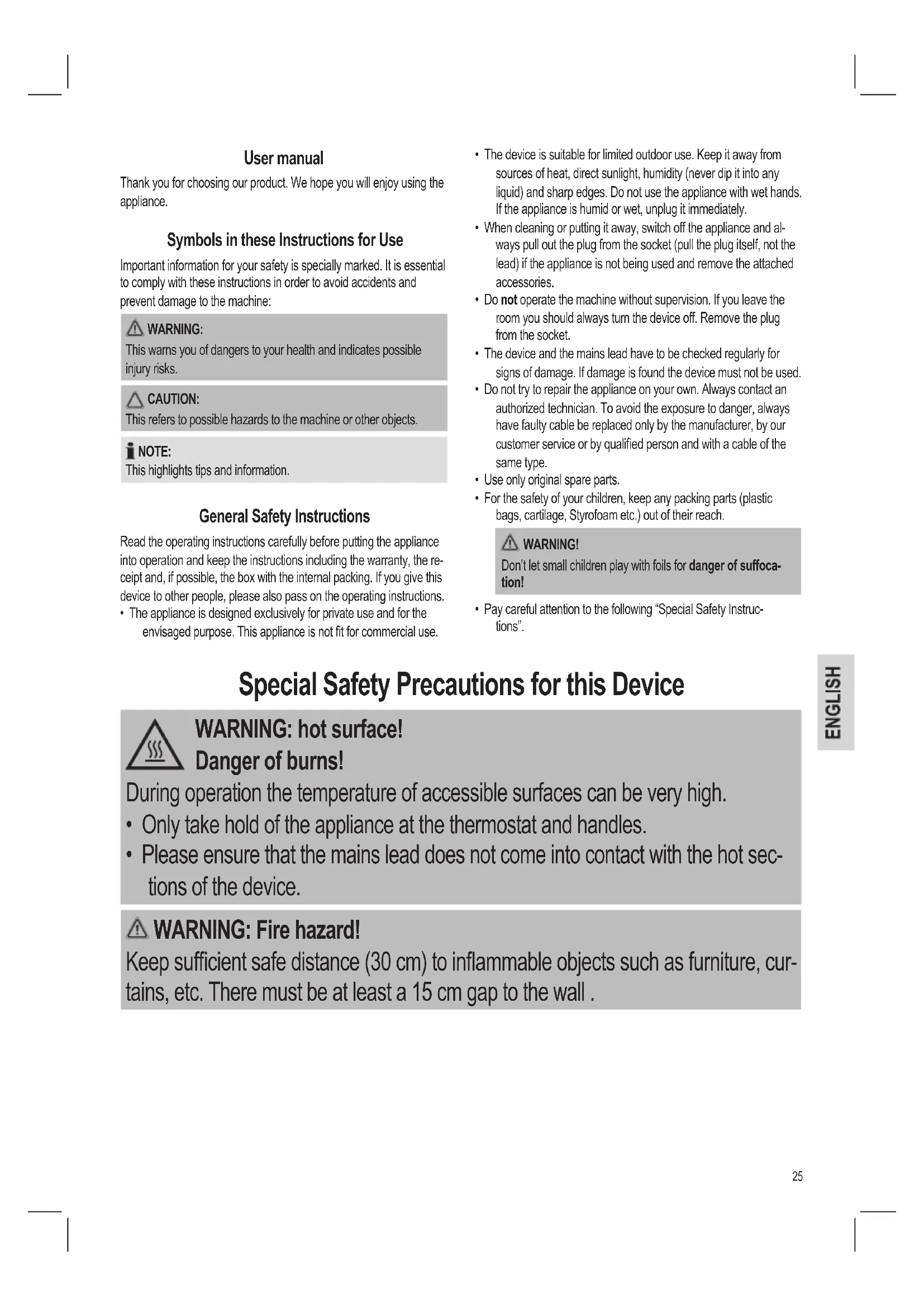 This warns you of dangers to your health and indicates possible injury risks. CAUTION: This refers to possible hazards to the machine or other objects. NOTE: This highlights tips and information. General Safety Instructions Read the operating instructions carefully before putting the appliance into operation and keep the instructions including the warranty, the re- ceipt and, if possible, the box with the internal packing. If you give this device to other people, please also pass on the operating instructions.