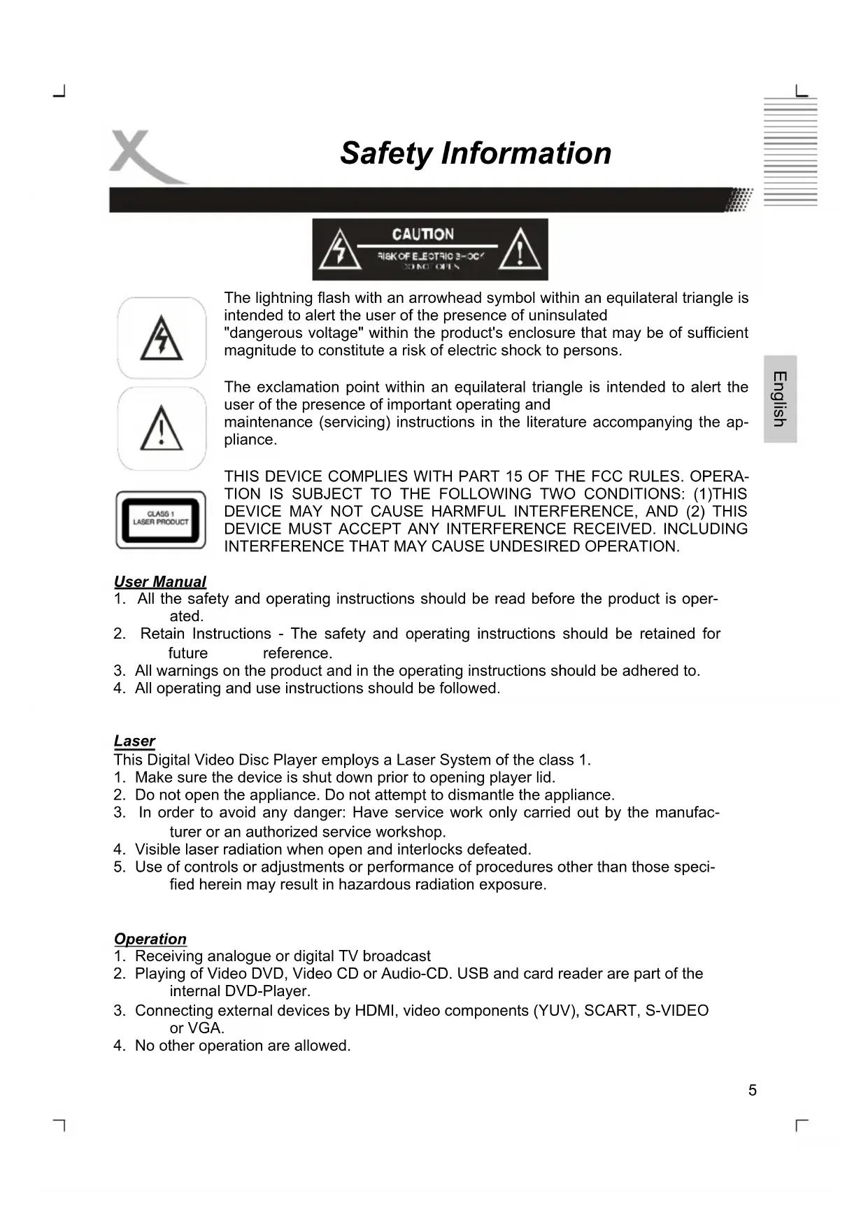 nect USB-Sticks to the USB port. Safety Information8 English Defect