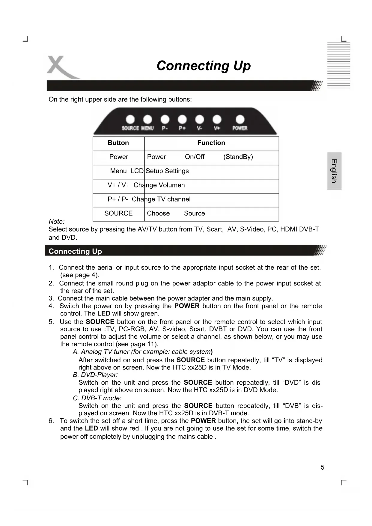 and the LED will show red . lf you are not going to use the set for some time, switch the power off completely by unplugging the mains cable . Connecting Up Connecting Up6 English Connection Power connection Connect the AC/DC power adapter with the DC IN input of the HTC TV set. After than, please connect the power cable with the wall mounted power outlet. On the front side you can see a red LED light. The HTC TV set is now in Stand-By mode. By pressing the POWER button on the remote control or on the top side of the device the red LED changes to a green light. Antenna The HTC TV set has an analogue and a digital TV Tuner inside. For receiving analogue TV signals please connect the antenna cable with the RF connector on the HTC TV set and with the VHF/UHF roof antenna or with a CATV antenna plug. For receiving digital terrestical TV signals please connect the HTC TV set with the RF plug and also with the roof antenna. If no roof antenna is available, please use indoor aerial. For activating the analogue TV Tuner, please switch with the Source button to „TV“. For viewing DVB-T, please change with the SOURCE button to „DVB“. Note: For getting the best DVB-T reception please uses the roof antenna. If not possible, than you can connect the HTC TV set with an active indoor aerial. SCART Input Audio– and Video signals from a VCR or a setop box can be transmitted by SCART. Please connect a SCART cable with the SCART input on the HTC TV set and with the SCART output on the VCR or setop box. Press the SOURCE button again until „SCART“ appears on the screen and the SCART interface is activated. CVBS Video– and Stereo Audio input If you uses more than one multimedia terminals and the SCART, HDMI and S-Video connection are used, than you connect the next device by the audio/video component input. Please connect the yellow wire of an 3-pin component cable with the VIDEO input of the HTC TV set and the multimedia device. With this kind of connection only video signals are transmitted. For listening sound on the TV you should establish also a sound connection. Please connect the white and red wire of the 3-pin component cable with the AUDIO IN L / R and the correspondent audio out on the multimedia device.7 English Connection Please press the SOURCE button until „AV“ appears on the screen and the AV input is ac- tive. S-Video Video- und Stereo Audio input If you uses more than one multimedia terminals and the SCART, HDMI and AV connection are used, than you connect the next device by the S-Video. Please connect the S-Video cable with the S-VIDEO input of the HTC TV set and with the S-Video output of the multime- dia device. With this kind of connection only video signals are transmitted. For listening sound on the TV you should establish also a sound connection. Please connect the white and red wire of the 2-pin cable with the AUDIO IN L / R and the correspondent audio out on the multimedia device. Please press the SOURCE button until „S-Video“ appears on the screen and the S-Video input is active. HDMI If you want connect a multimedia device with HDMI like a game console „PS3“ or a setop box with the HTC TV set, you can establish a HDMI connection. Please con- nect the HDMI cable on the HDMI interface on the HTC TV set and the HDMI output of the multimedia device. Please press the SOURCE button until „HDMI“ appears on the screen and the HDMI input is active.