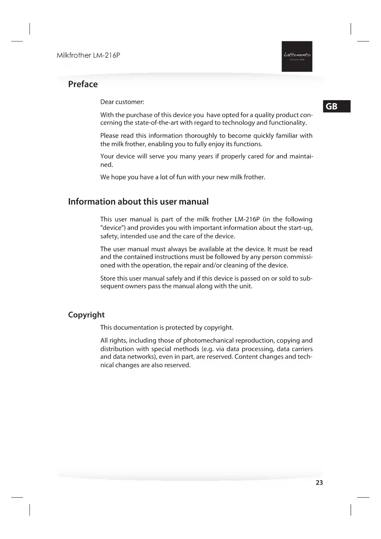 USER MANUAL LM216P Lattemento