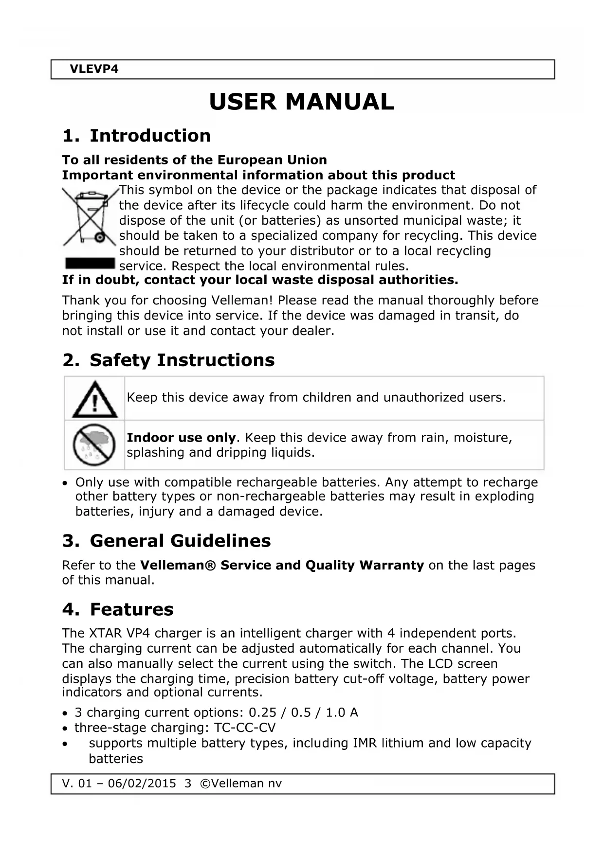 Download the instructions for your Battery charger in PDF format for free! Find your manual VLEVP4 - VELLEMAN and take your electronic device back in hand. On this page are published all the documents necessary for the use of your device. VLEVP4 by VELLEMAN.