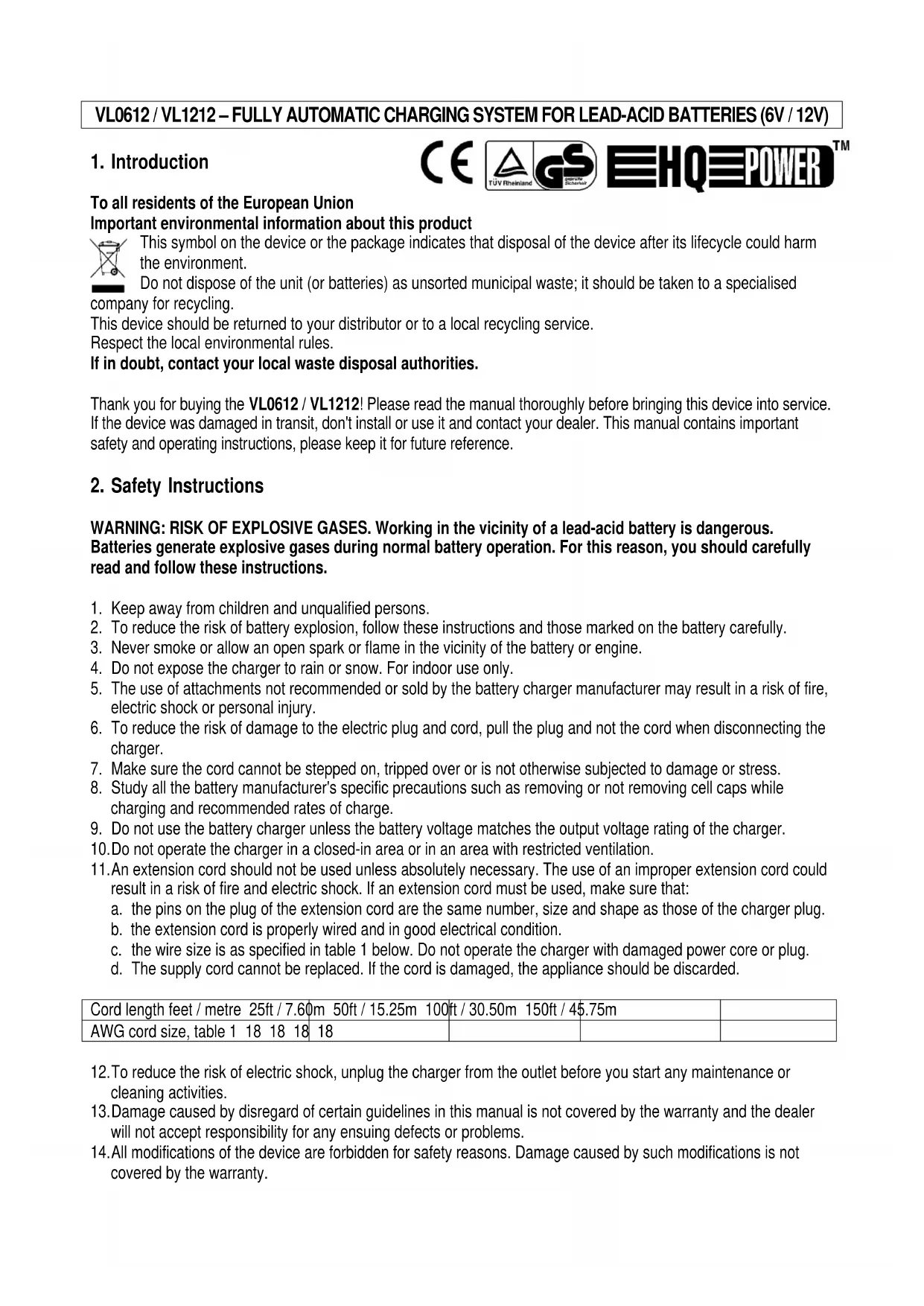 result in a risk of fire and electric shock. If an extension cord must be used, make sure that: a. the pins on the plug of the extension cord are the same number, size and shape as those of the charger plug. b. the extension cord is properly wired and in good electrical condition. c. the wire size is as specified in table 1 below. Do not operate the charger with damaged power core or plug. d. The supply cord cannot be replaced. If the cord is damaged, the appliance should be discarded. Cord length feet / metre 25ft / 7.60m 50ft / 15.25m 100ft / 30.50m 150ft / 45.75m AWG cord size, table 1 18 18 18 18
