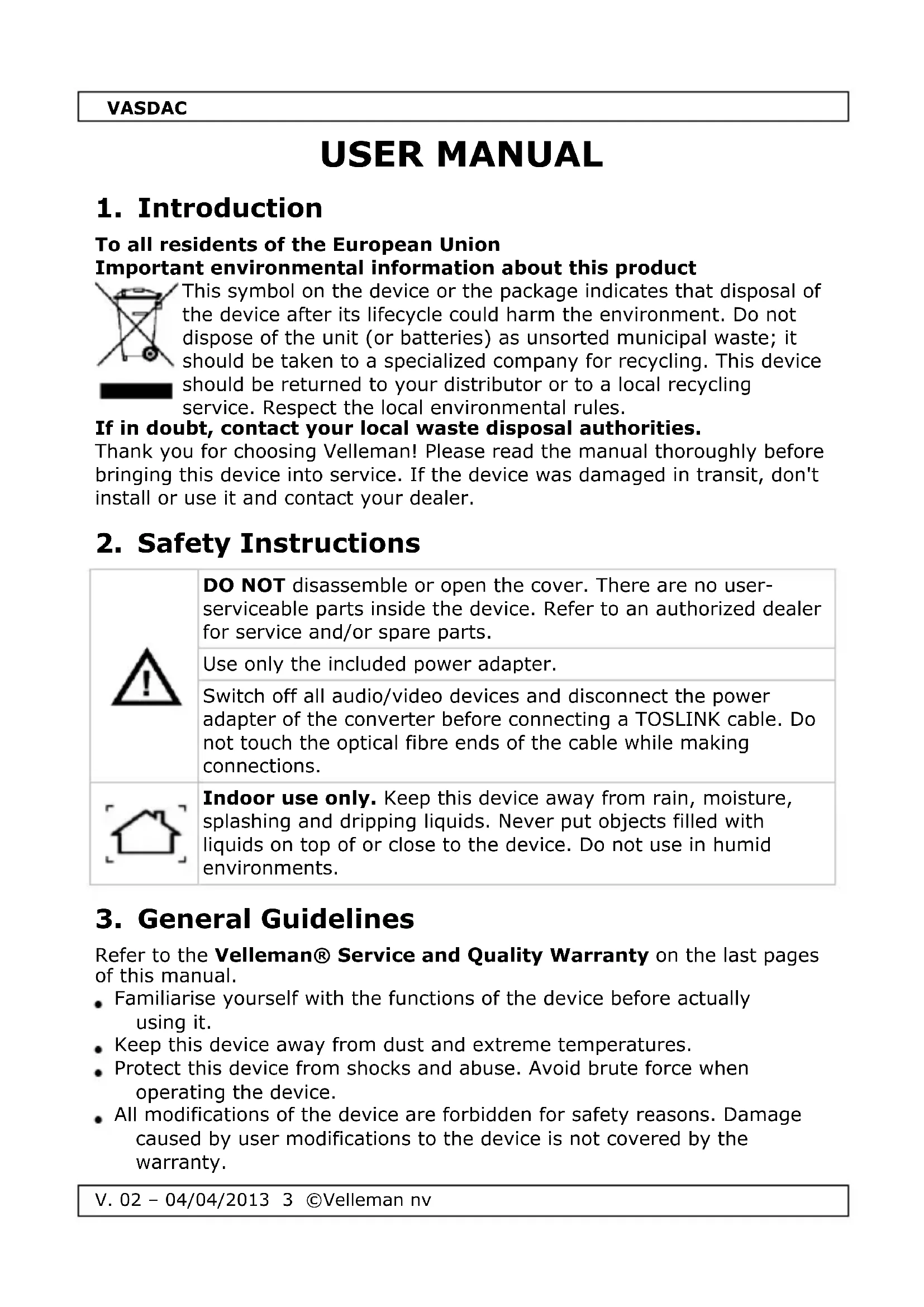 Download the instructions for your Hi-fi system in PDF format for free! Find your manual VASDAC - VELLEMAN and take your electronic device back in hand. On this page are published all the documents necessary for the use of your device. VASDAC by VELLEMAN.