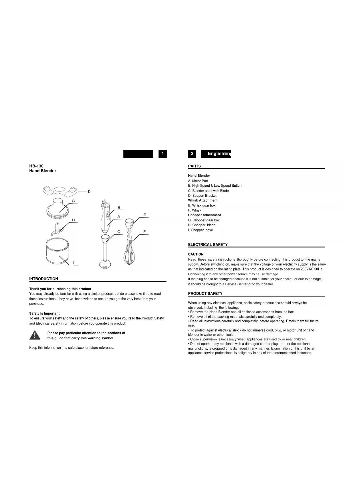 Never switch on the Hand Blender before you have placed it in the mixing beaker or other mixing vessel. The sharp blades of the stainless steel knives can cause injury if this is adhered to.