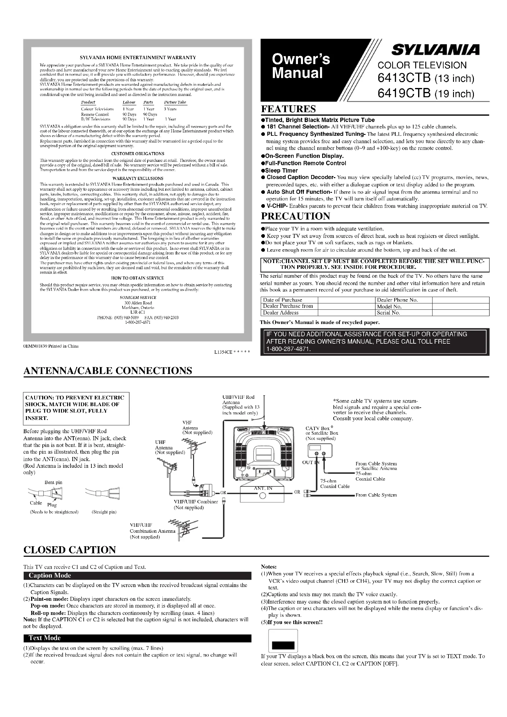 PRECAUTION ● Place your TV in a room with adequate ventilation. ● Keep your TV set away from sources of direct heat, such as heat registers or direct sunlight. ● Do not place your TV on soft surfaces, such as rugs or blankets. ● Leave enough room for air to circulate around the bottom, top and back of the set. FEATURES ● Tinted, Bright Black Matrix Picture Tube ● 181 Channel Selection- All VHF/UHF channels plus up to 125 cable channels. ● PLL Frequency Synthesized Tuning- The latest PLL frequency synthesized electronic tuning system provides free and easy channel selection, and lets you tune directly to any chan-nel using the channel number buttons (0~9 and +100-key) on the remote control.● On-Screen Function Display.● Full-Function Remote Control● Sleep Timer ● Closed Caption Decoder- You may view specially labeled (cc) TV programs, movies, news, prerecorded tapes, etc. with either a dialogue caption or text display added to the program. ● Auto Shut Off Function- If there is no air signal input from the antenna terminal and no operation for 15 minutes, the TV will turn itself off automatically. ● V-CHIP- Enables parents to prevent their children from watching inappropriate material on TV. COLOR TELEVISION 6413CTB (13 inch) 6419CTB (19 inch) Date of PurchaseDealer Purchase fromDealer AddressDealer Phone No.Model No.Serial No. The serial number of this product may be found on the back of the TV. No others have the sameserial number as yours. You should record the number and other vital information here and retainthis book as a permanent record of your purchase to aid identification in case of theft. ANT.IN CLOSED CAPTION UHF Antenna(Not supplied) VHF Antenna(Not supplied)VHF/UHF Combiner(Not supplied)VHF/UHFCombination Antenna(Not supplied)UHF/VHF RodAntenna(Supplied with 13inch model only)