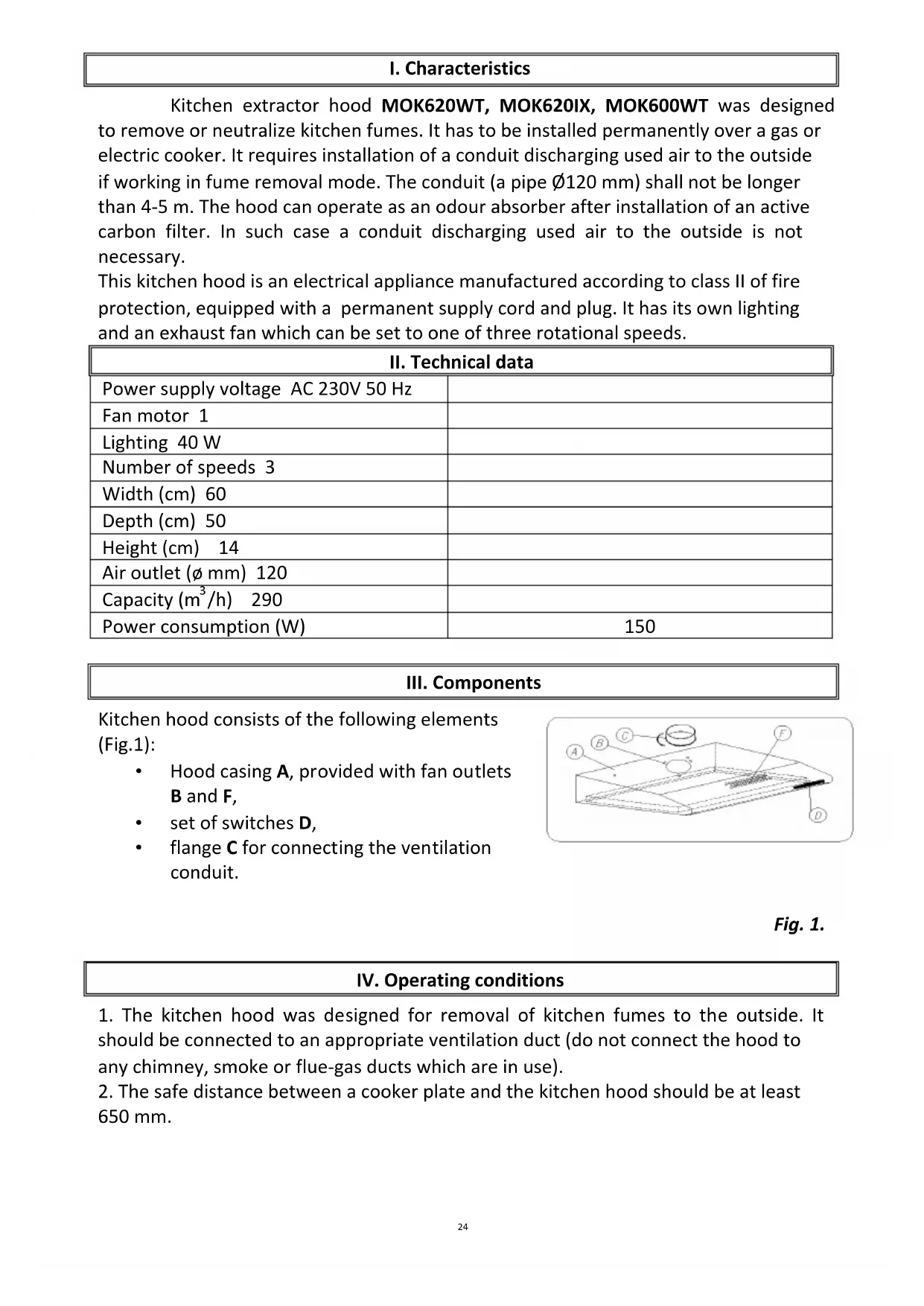 Kitchen extractor hood MOK620WT, MOK620IX, MOK600WT was designed to remove or neutralize kitchen fumes. It has to be installed permanently over a gas or electric cooker. It requires installation of a conduit discharging used air to the outside if working in fume removal mode. The conduit (a pipe Ø120 mm) shall not be longer than 4-5 m. The hood can operate as an odour absorber after installation of an active carbon filter. In such case a conduit discharging used air to the outside is not necessary. This kitchen hood is an electrical appliance manufactured according to class II of fire protection, equipped with a permanent supply cord and plug. It has its own lighting and an exhaust fan which can be set to one of three rotational speeds.