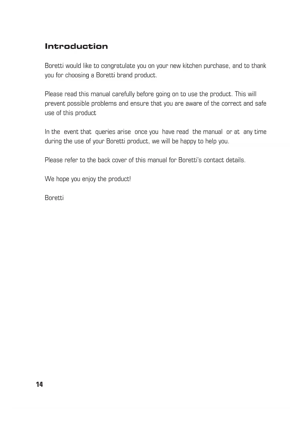 standards of the cleaning of the cooker hood and replacement of the filters may cause fire risks. Therefore we recommend observing the- se instructions. Anti-grease Filter The anti-grease filter must be cleaned once a month, with non abrasive detergents by hand, or in dishwasher on low temperature and short cycle. When washed in a dishwasher, the gre- ase filter may discolour slightly, but this does not affect its filtering capacity. Charcoal Filter - (only for filter version) The active charcoal filters are not washable nor regenerative. It should be changed every 4 months in normal use. Replacing light bulbs Warning! Before touching the bulbs, make sure they are cool. Carefully remove the glass lamp cover with a screwdriver (refer to the drawings on the last pages). Remove the defective bulb. Use only halogen bulbs with a maximum rating of 20 W, and make sure you do not touch them with your bare hand. Then fit the glass lamp cover in its original position. Caution This appliance is designed to be operated by adults. Children should not be allowed to tam- per with the controls or play with the appli- ance. Do not use the cooker hood where the grill is not correctly fixed! The suctioned air must not be conveyed in the same channel used for fumes discharged by appliances powered by other than electricity. The environment must always be adequately aerated when the cooker hood and other appliances powered by other than electricity are used at the same time. Flambé cooking with a cooker hood is prohibi- ted. The use of a free flame is damaging to the filters and may cause fire accidents, therefore free flame cooking must be avoided. Frying of foods must be kept under close control in or- der to avoid overheated oil catching fire. Carry out fumes discharging in accordance with the regulations in force by local laws for safety and technical restrictions.BORETTI B.V. De Dollard 17 1454 AT Watergang T +31(0)20-4363439 F +31(0)20-4361326 S 0900-2352673 (service) E info@boretti.com The Netherlands N.V. BORETTI S.A. Ruperlweg 16 2850 Boom T +32(0)3-4508180 F +32(0)3-4586847 E info@boretti.com Belgium BORETTI S.L. Oficina en Avd. de la Barrosa 63c 11139 Chiclana de la Frontera (Cadiz) T +34 956 494684 F +34 956 494150 E info@boretti.com Spain