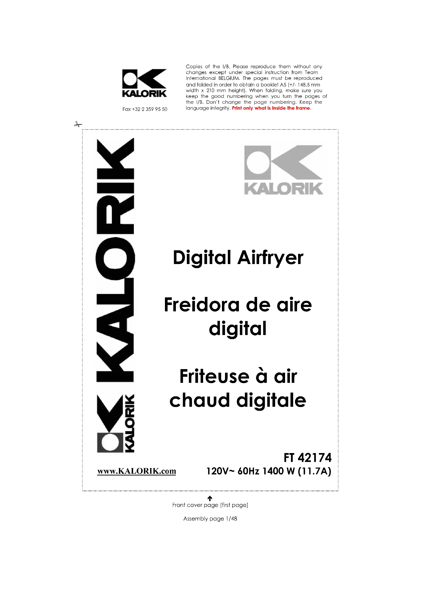 Copies of the I/B. Please reproduce them without any changes except under special instruction from Team International BELGIUM. The pages must be reproduced and folded in order to obtain a booklet A5 (+/- 148.5 mm width x 210 mm height). When folding, make sure you keep the good numbering when you turn the pages of the I/B. Don’t change the page numbering. Keep the language integrity. Print only what is inside the frame. Front cover page (first page) Assembly page 1/48