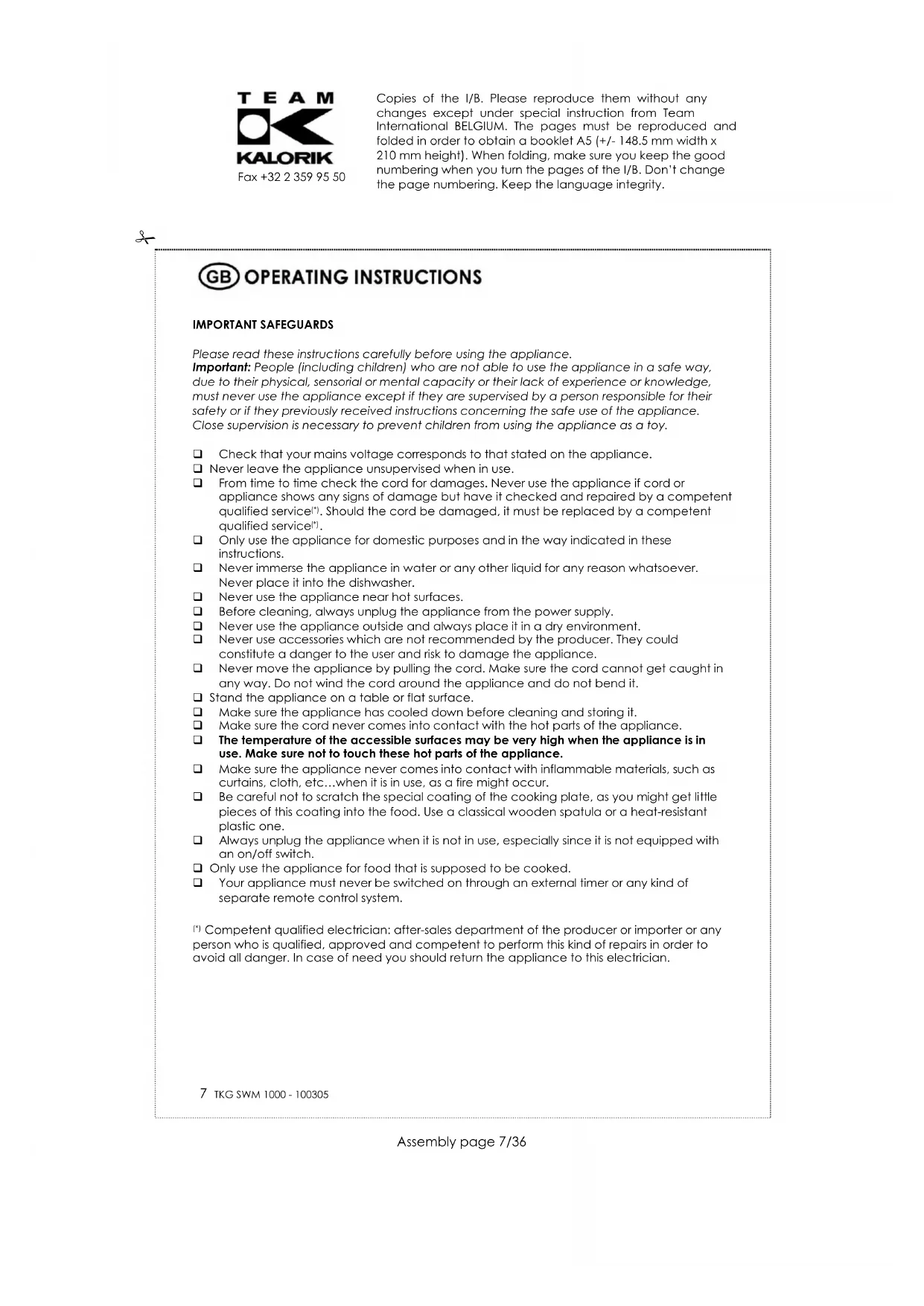Fax +32 2 359 95 50 Copies of the I/B. Please reproduce them without any changes except under special instruction from Team International BELGIUM. The pages must be reproduced and folded in order to obtain a booklet A5 (+/- 148.5 mm width x 210 mm height). When folding, make sure you keep the good numbering when you turn the pages of the I/B. Don’t change the page numbering. Keep the language integrity.