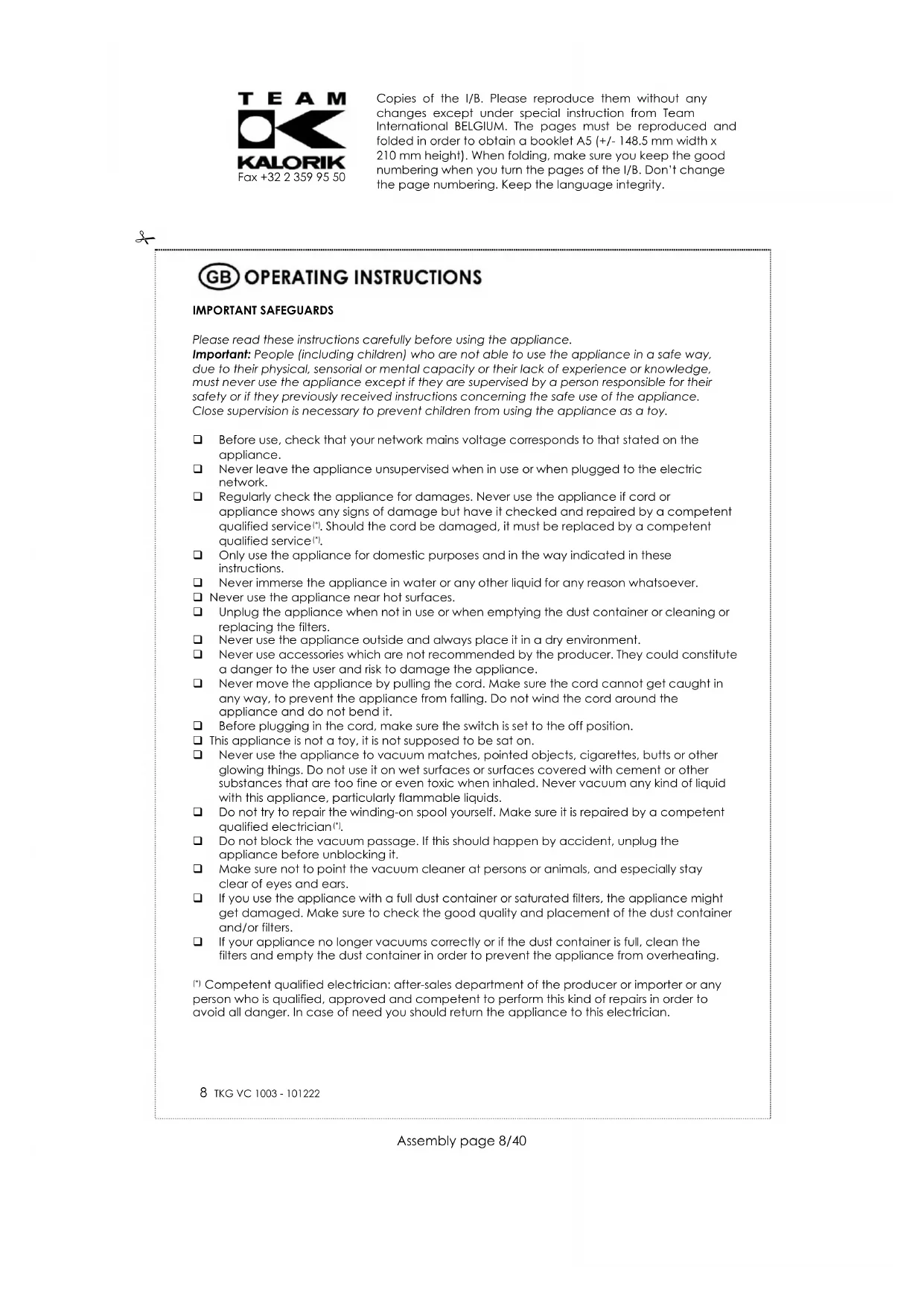 Download the instructions for your Vacuum Cleaner in PDF format for free! Find your manual TKG VC 1003 - KALORIK and take your electronic device back in hand. On this page are published all the documents necessary for the use of your device. TKG VC 1003 by KALORIK.