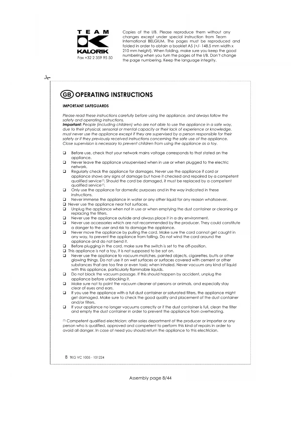 Copies of the I/B. Please reproduce them without any changes except under special instruction from Team International BELGIUM. The pages must be reproduced and folded in order to obtain a booklet A5 (+/- 148.5 mm width x 210 mm height). When folding, make sure you keep the good numbering when you turn the pages of the I/B. Don't change the page numbering. Keep the language integrity.