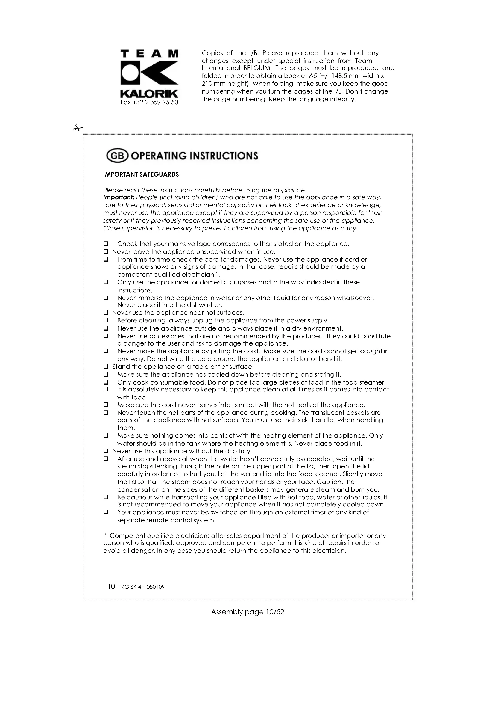 The baskets, the drip tray and the lid may be washed with soapy water. Never use abrasive cleaners to clean your appliance: it could damage the surfaces. The body of the appliance should be washed with a smooth cloth or with a slightly damp towelling. Never immerse the body in water or any other liquid. Copies of the I/B. Please reproduce them without any changes except under special instruction from Team International BELGIUM. The pages must be reproduced and folded in order to obtain a booklet A5 (+/- 148.5 mm width x 210 mm height). When folding, make sure you keep the good numbering when you turn the pages of the I/B. Don’t change the page numbering. Keep the language integrity.