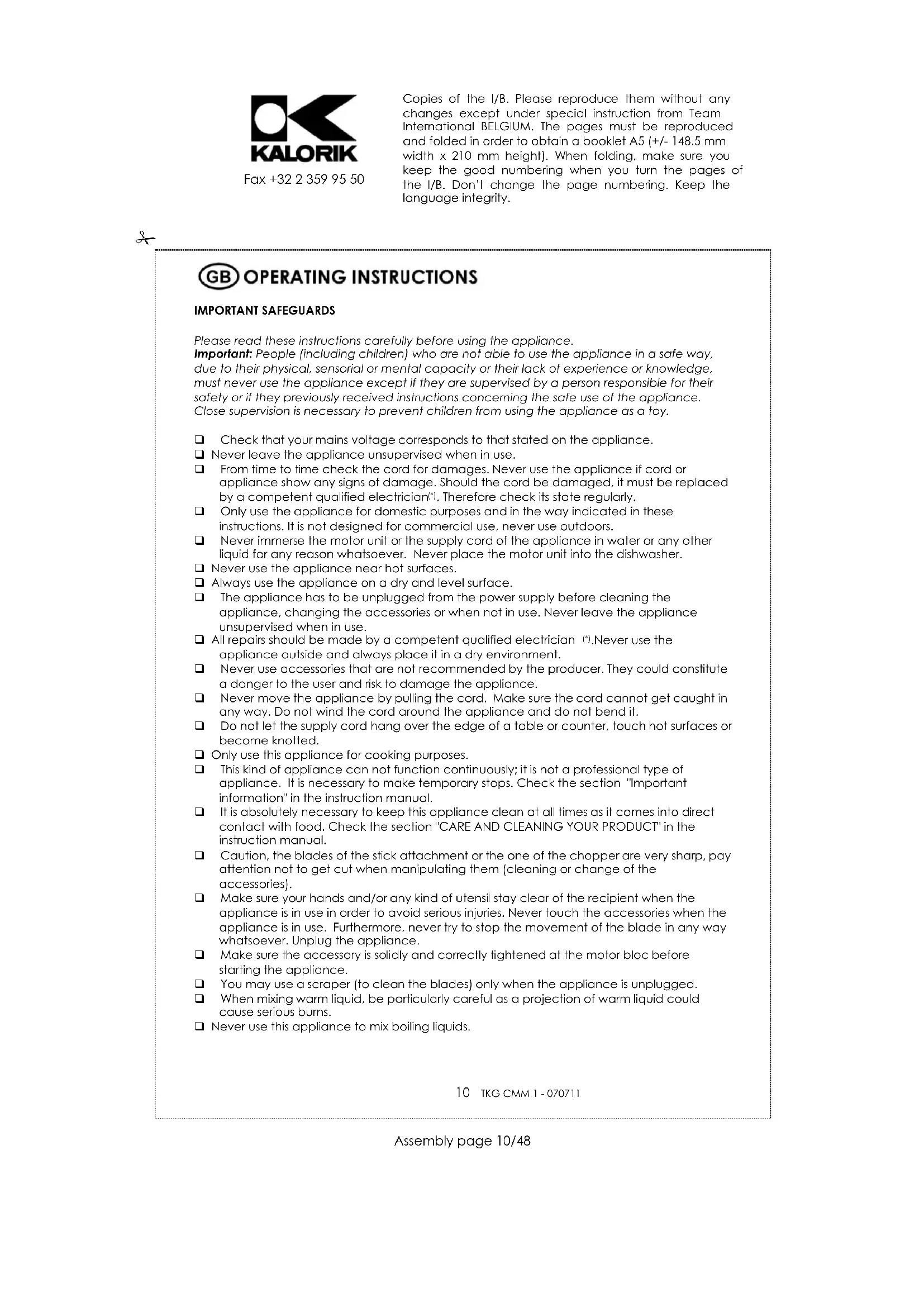 - Waschen Sie den Mixstab in warmen Seifenwasser ab Copies of the I/B. Please reproduce them without any changes except under special instruction from Team International BELGIUM. The pages must be reproduced and folded in order to obtain a booklet A5 (+/- 148.5 mm width x 210 mm height). When folding, make sure you keep the good numbering when you turn the pages of the I/B. Don’t change the page numbering. Keep the language integrity.