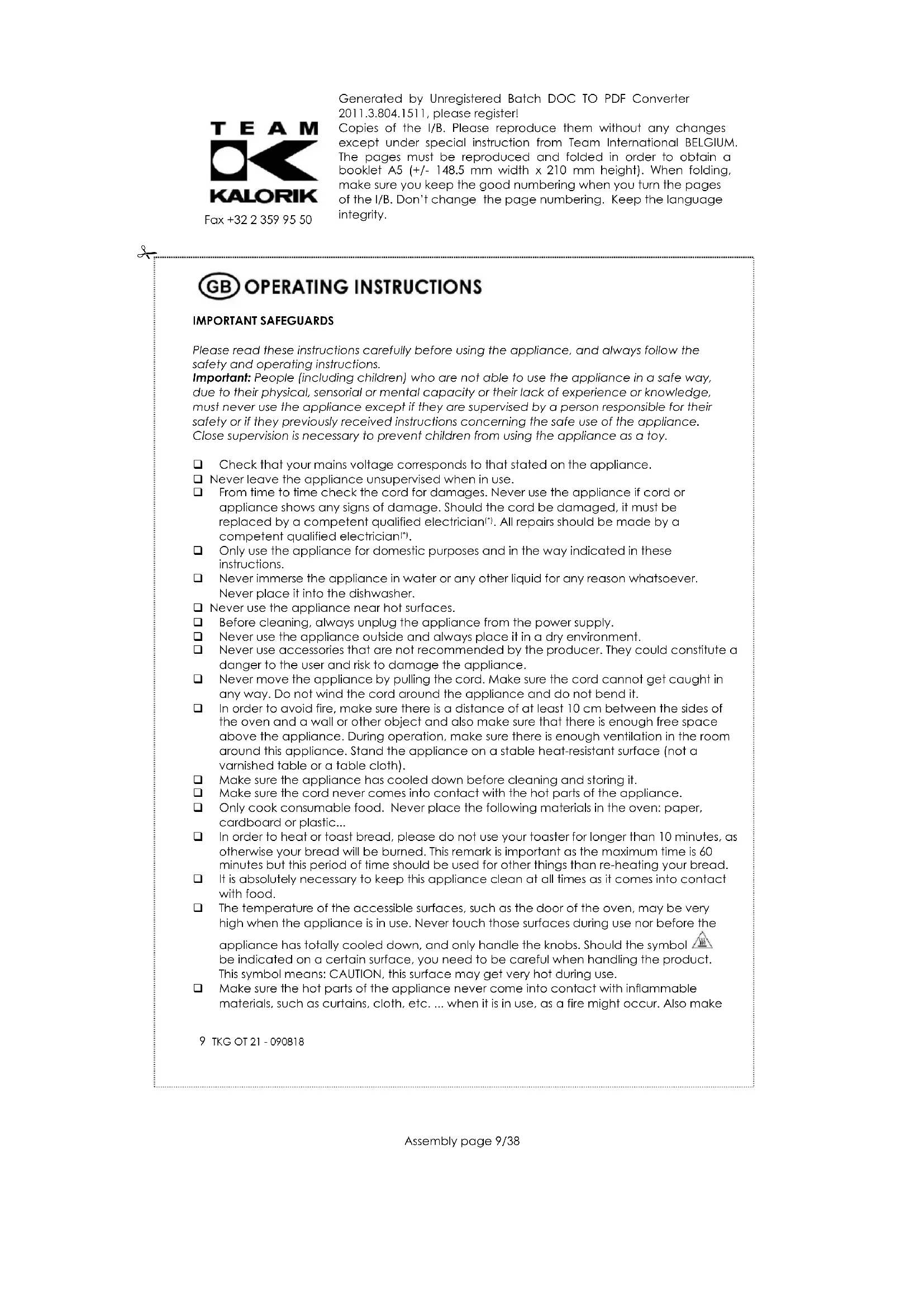 Fax +32 2 359 95 50 Generated by Unregistered Batch DOC TO PDF Converter 2011.3.804.1511, please register! Copies of the I/B. Please reproduce them without any changes except under special instruction from Team International BELGIUM. The pages must be reproduced and folded in order to obtain a booklet A5 (+/- 148.5 mm width x 210 mm height). When folding, make sure you keep the good numbering when you turn the pages of the I/B. Don’t change the page numbering. Keep the language integrity.