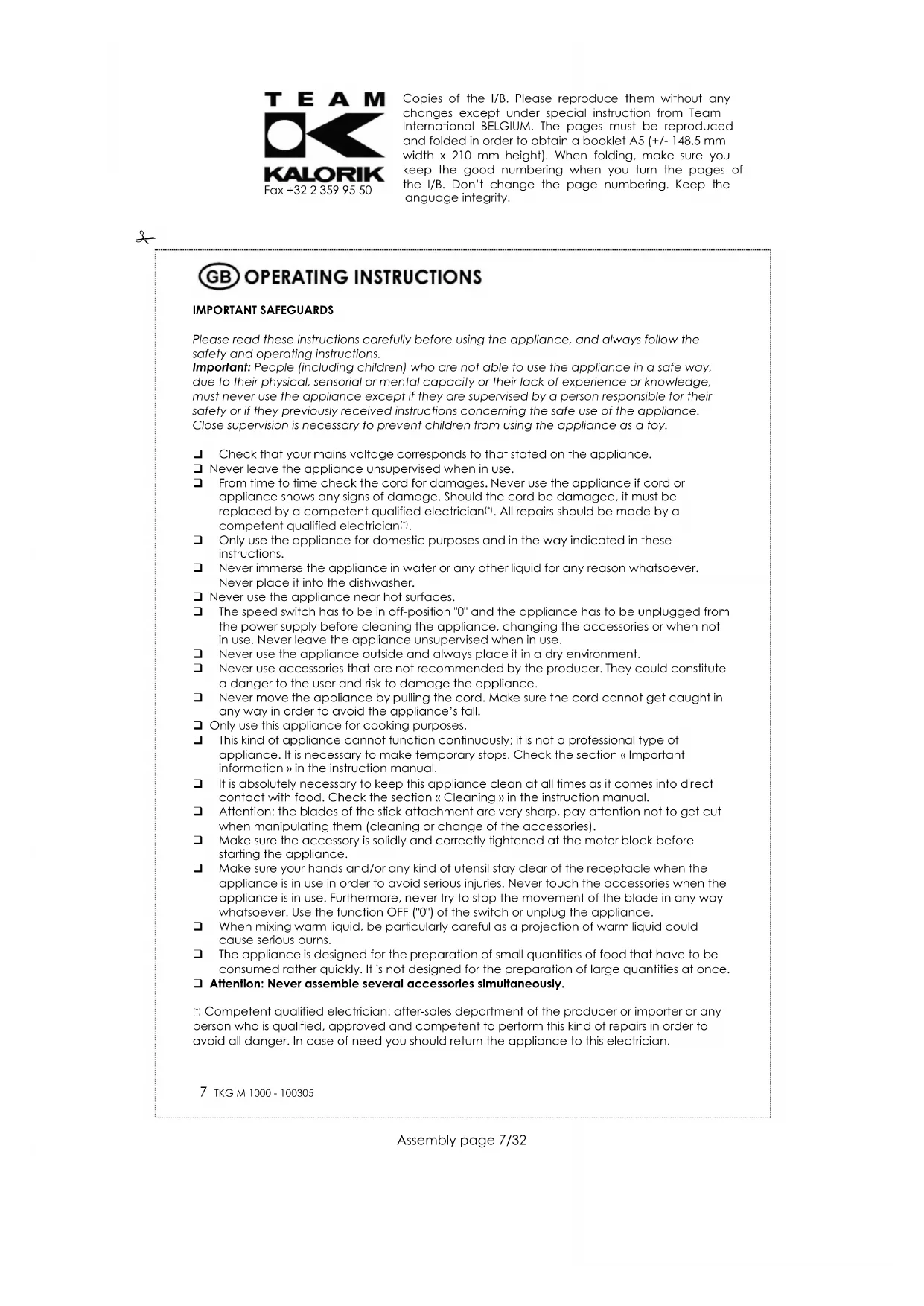 Fax +32 2 359 95 50 Copies of the I/B. Please reproduce them without any changes except under special instruction from Team International BELGIUM. The pages must be reproduced and folded in order to obtain a booklet A5 (+/- 148.5 mm width x 210 mm height). When folding, make sure you keep the good numbering when you turn the pages of the I/B. Don’t change the page numbering. Keep the language integrity.