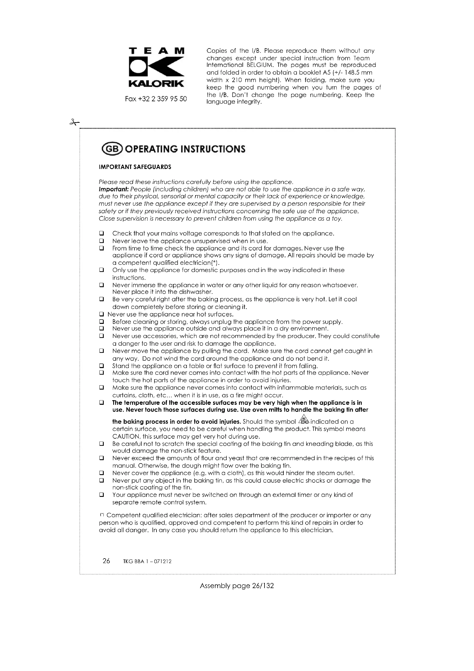 In order to preserve our environment and protect human health, the waste electrical and electronic equipment should be disposed of in accordance with specific rules with the implication of both suppliers and users. For this reason, as indicated by the symbol on the rating label or on the packaging, your appliance should not be disposed of as unsorted municipal waste. The user has the right to bring it to a municipal collection point performing waste recovery by means of reuse, recycling or use for other applications in accordance with the directive. Copies of the I/B. Please reproduce them without any changes except under special instruction from Team International BELGIUM. The pages must be reproduced and folded in order to obtain a booklet A5 (+/- 148.5 mm width x 210 mm height). When folding, make sure you keep the good numbering when you turn the pages of the I/B. Don‟t change the page numbering. Keep the language integrity. 45 TKG BBA 1 – 071212
