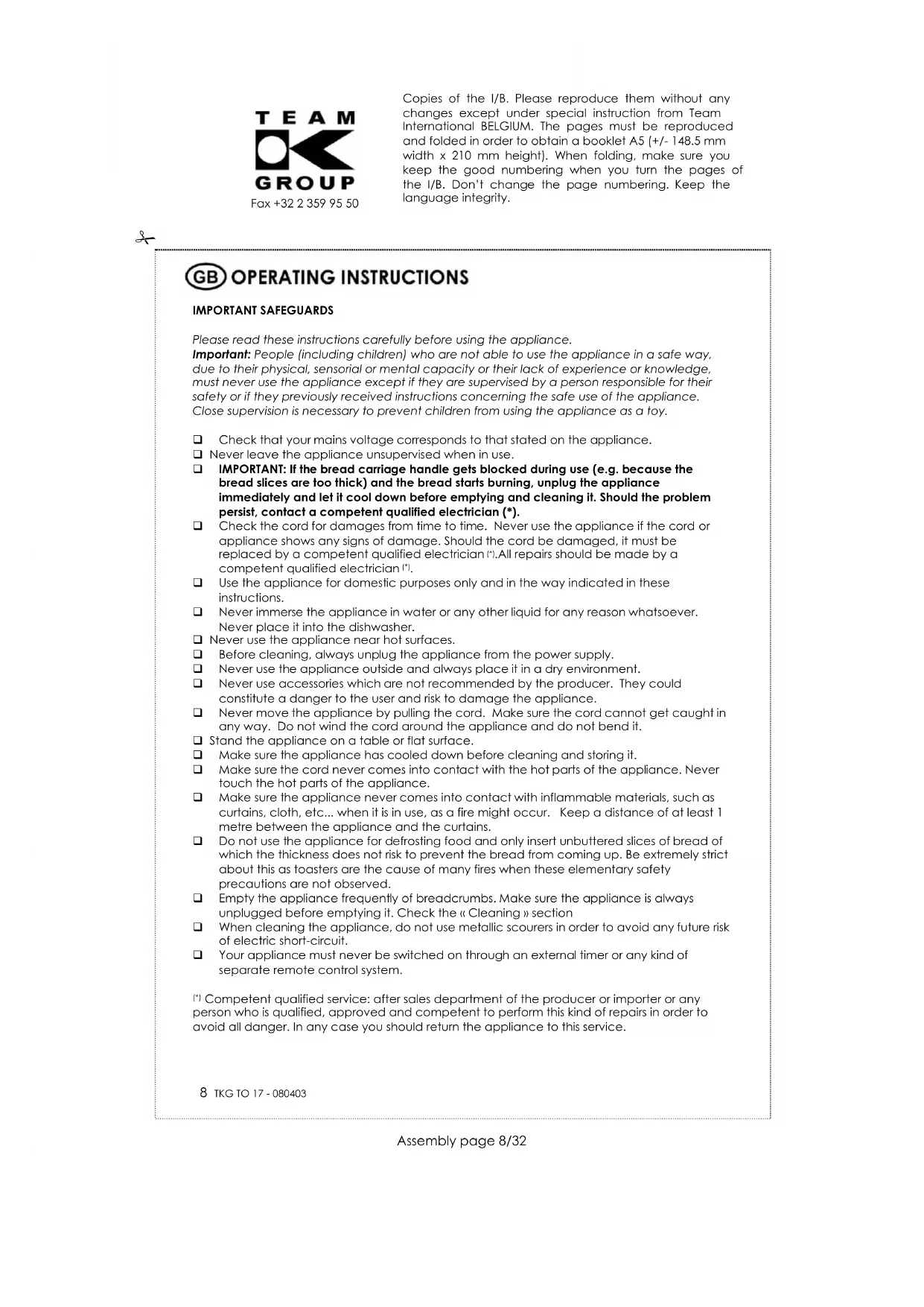 Fax +32 2 359 95 50 Copies of the I/B. Please reproduce them without any changes except under special instruction from Team International BELGIUM. The pages must be reproduced and folded in order to obtain a booklet A5 (+/- 148.5 mm width x 210 mm height). When folding, make sure you keep the good numbering when you turn the pages of the I/B. Don’t change the page numbering. Keep the language integrity.