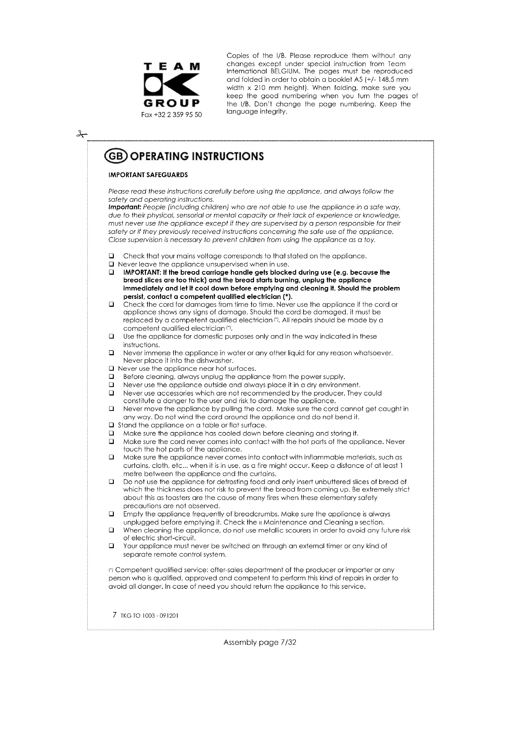 Fax +32 2 359 95 50 Copies of the I/B. Please reproduce them without any changes except under special instruction from Team International BELGIUM. The pages must be reproduced and folded in order to obtain a booklet A5 (+/- 148.5 mm width x 210 mm height). When folding, make sure you keep the good numbering when you turn the pages of the I/B. Don’t change the page numbering. Keep the language integrity.