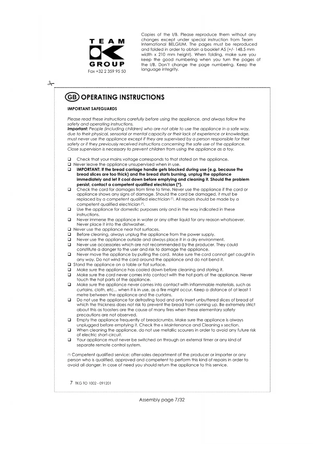 Fax +32 2 359 95 50 Copies of the I/B. Please reproduce them without any changes except under special instruction from Team International BELGIUM. The pages must be reproduced and folded in order to obtain a booklet A5 (+/- 148.5 mm width x 210 mm height). When folding, make sure you keep the good numbering when you turn the pages of the I/B. Don’t change the page numbering. Keep the language integrity.