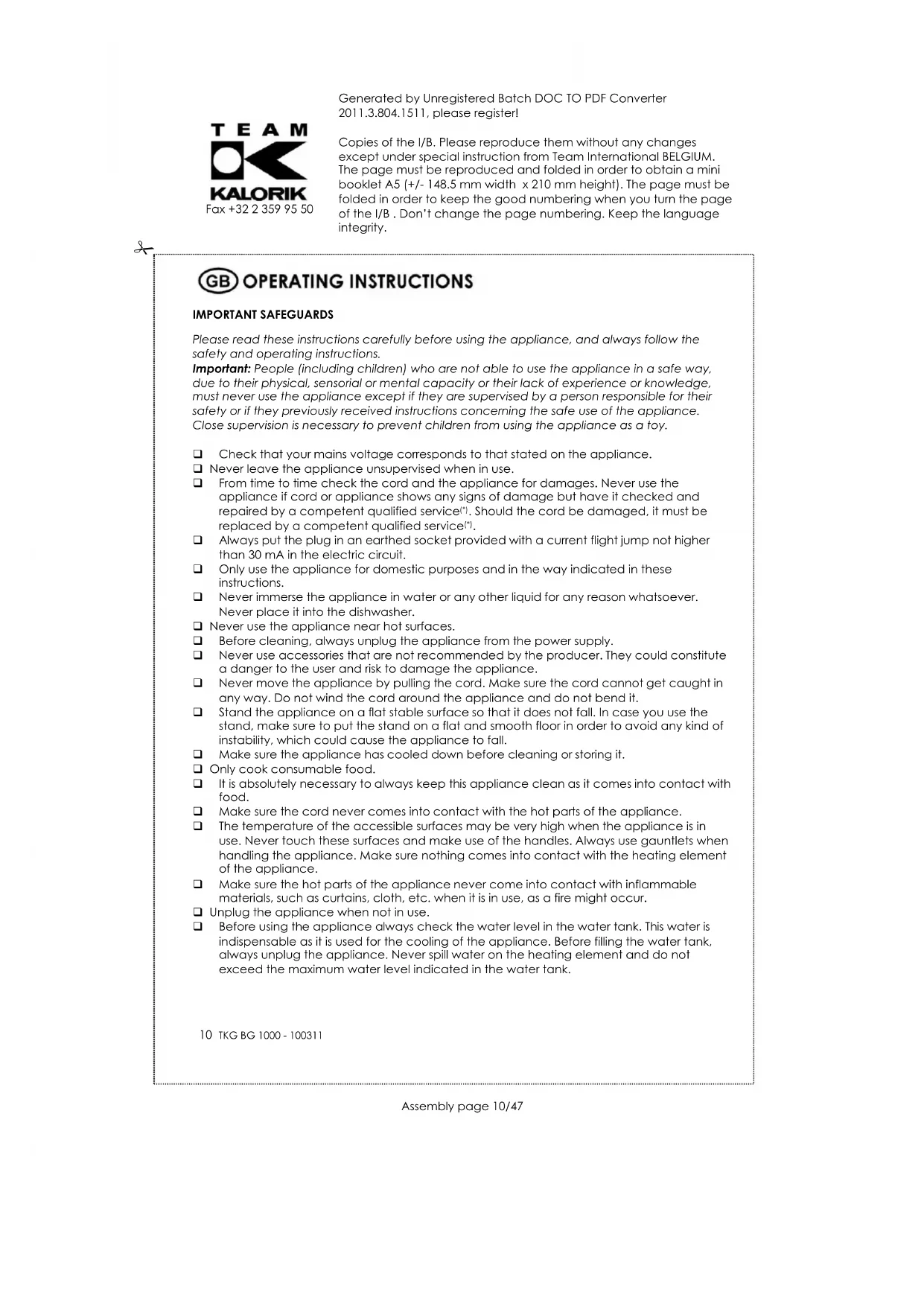 implication of both suppliers and users. For this reason, as indicated by the symbol on the rating label or on the packaging, your appliance should not be disposed of as unsorted municipal waste. The user has the right to bring it to a municipal collection point performing waste recovery by means of reuse, recycling or use for other applications in accordance with the directive.Generated by Unregistered Batch DOC TO PDF Converter 2011.3.804.1511, please register! Copies of the I/B. Please reproduce them without any changes except under special instruction from Team International BELGIUM. The page must be reproduced and folded in order to obtain a mini booklet A5 (+/- 148.5 mm width x 210 mm height). The page must be folded in order to keep the good numbering when you turn the page of the I/B . Don’t change the page numbering. Keep the language integrity.