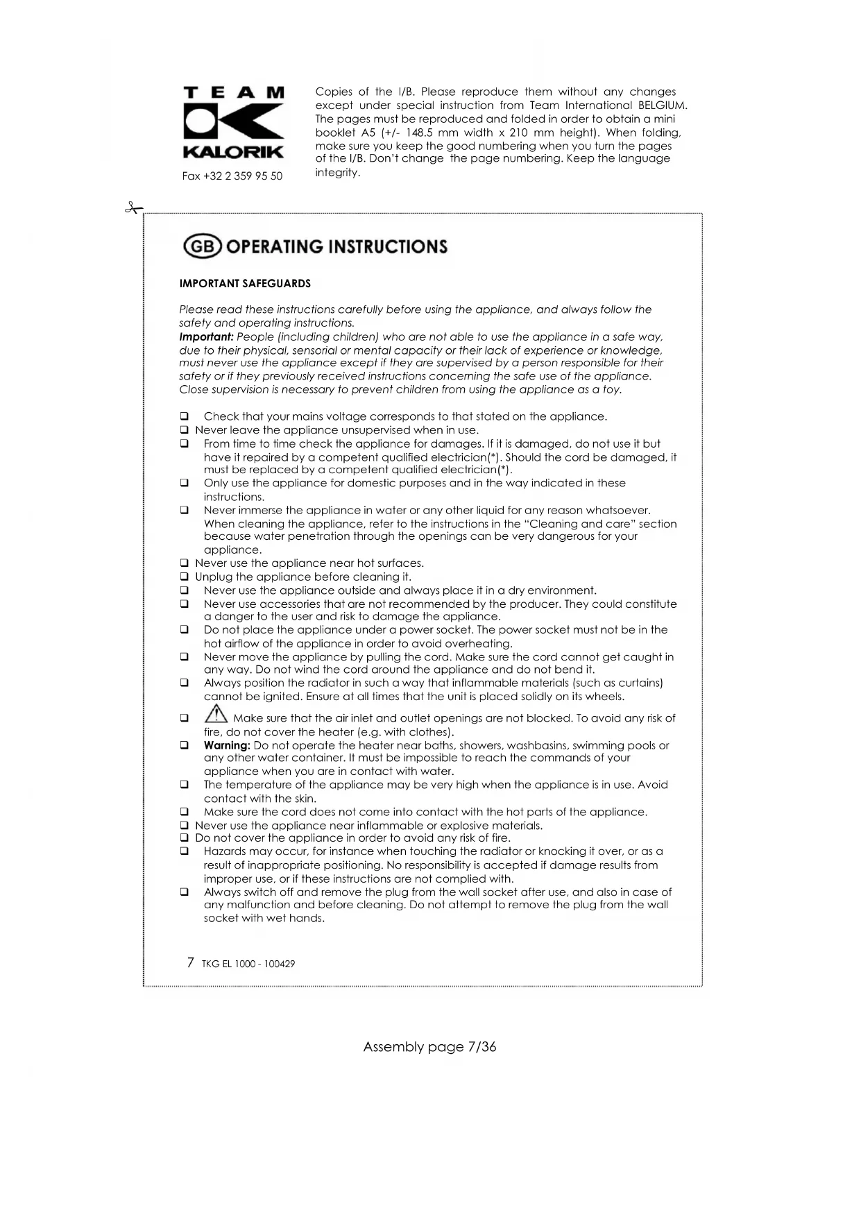 any other water container. It must be impossible to reach the commands of your appliance when you are in contact with water. The temperature of the appliance may be very high when the appliance is in use. Avoid contact with the skin. Make sure the cord does not come into contact with the hot parts of the appliance. Never use the appliance near inflammable or explosive materials. Do not cover the appliance in order to avoid any risk of fire. Hazards may occur, for instance when touching the radiator or knocking it over, or as a result of inappropriate positioning. No responsibility is accepted if damage results from improper use, or if these instructions are not complied with. Always switch off and remove the plug from the wall socket after use, and also in case of any malfunction and before cleaning. Do not attempt to remove the plug from the wall socket with wet hands.Copies of the I/B. Please reproduce them without any changes except under special instruction from Team International BELGIUM. The pages must be reproduced and folded in order to obtain a mini booklet A5 (+/- 148.5 mm width x 210 mm height). When folding, make sure you keep the good numbering when you turn the pages of the I/B. Don’t change the page numbering. Keep the language integrity.