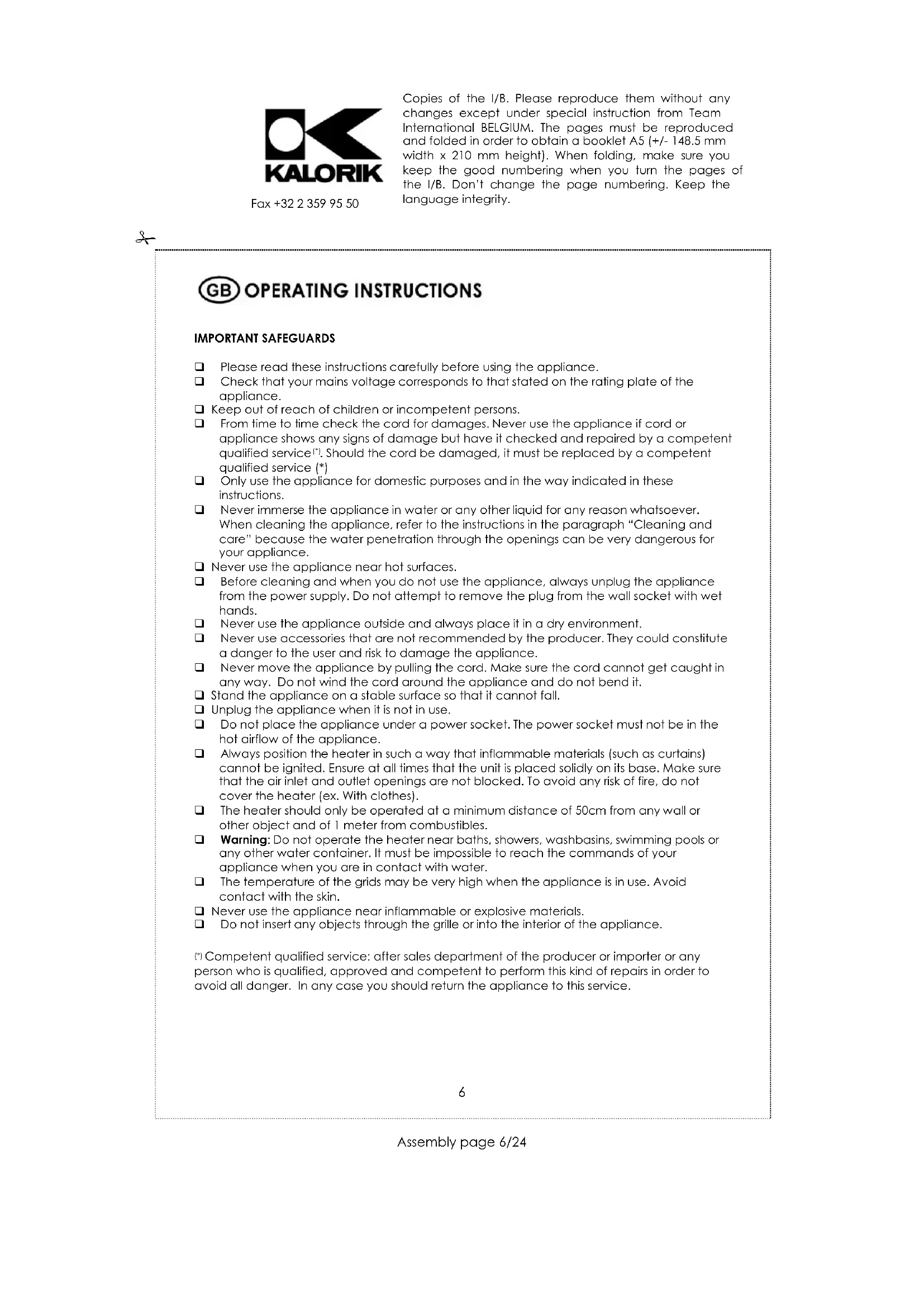 Before cleaning the appliance, ensure it is disconnected from the power supply and has cooled down completely. To avoid the risk of electric shock, do not clean the heater with water and do not immerse it. Clean the housing with a damp cloth. If necessary, dust particles accumulated in the air outlet openings may be removed with a vacuum cleaner. This maintenance should be done regularly to assure the good operation of the appliance. Copies of the I/B. Please reproduce them without any changes except under special instruction from Team International BELGIUM. The pages must be reproduced and folded in order to obtain a booklet A5 (+/- 148.5 mm width x 210 mm height). When folding, make sure you keep the good numbering when you turn the pages of the I/B. Don’t change the page numbering. Keep the language integrity.
