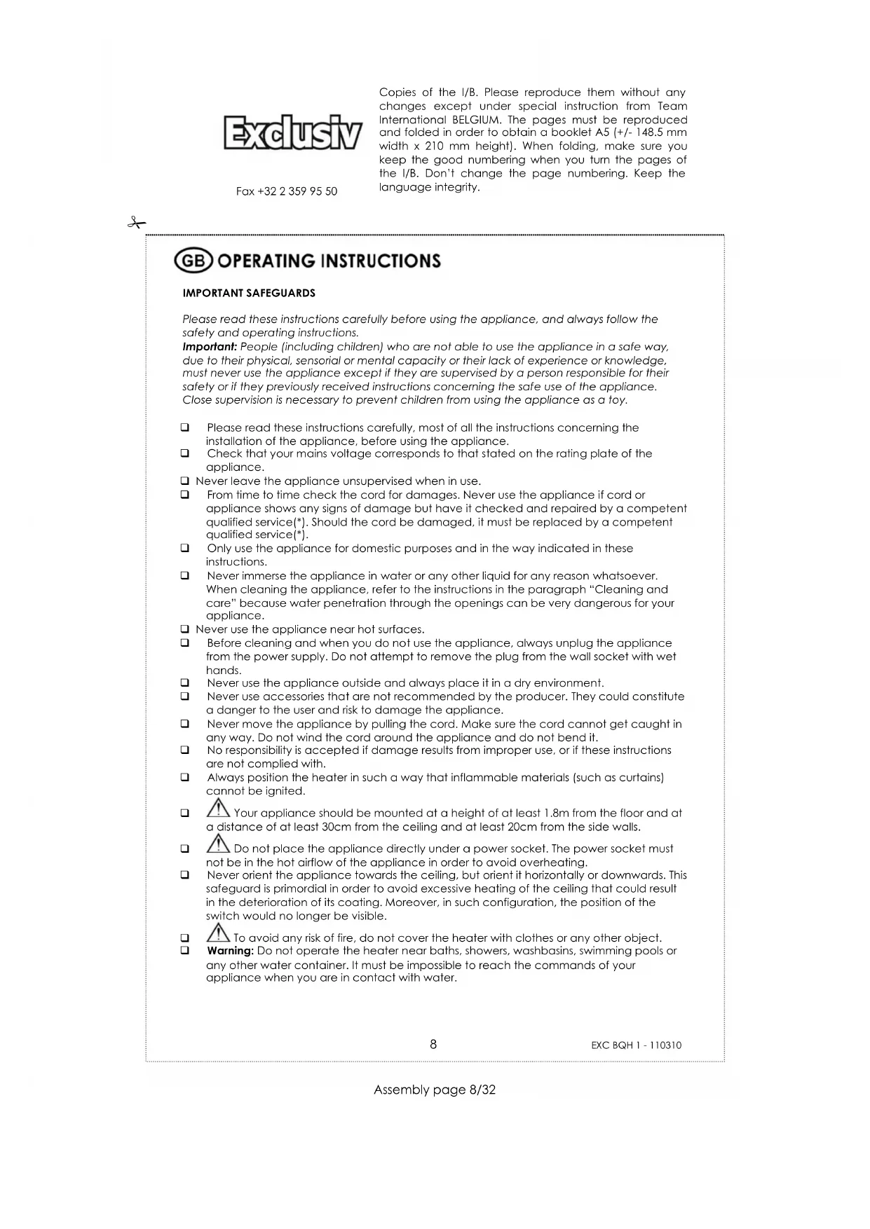 Assembly page 10/32 Copies of the I/B. Please reproduce them without any changes except under special instruction from Team International BELGIUM. The pages must be reproduced and folded in order to obtain a booklet A5 (+/- 148.5 mm width x 210 mm height). When folding, make sure you keep the good numbering when you turn the pages of the I/B. Don’t change the page numbering. Keep the language integrity. Fax +32 2 359 95 50